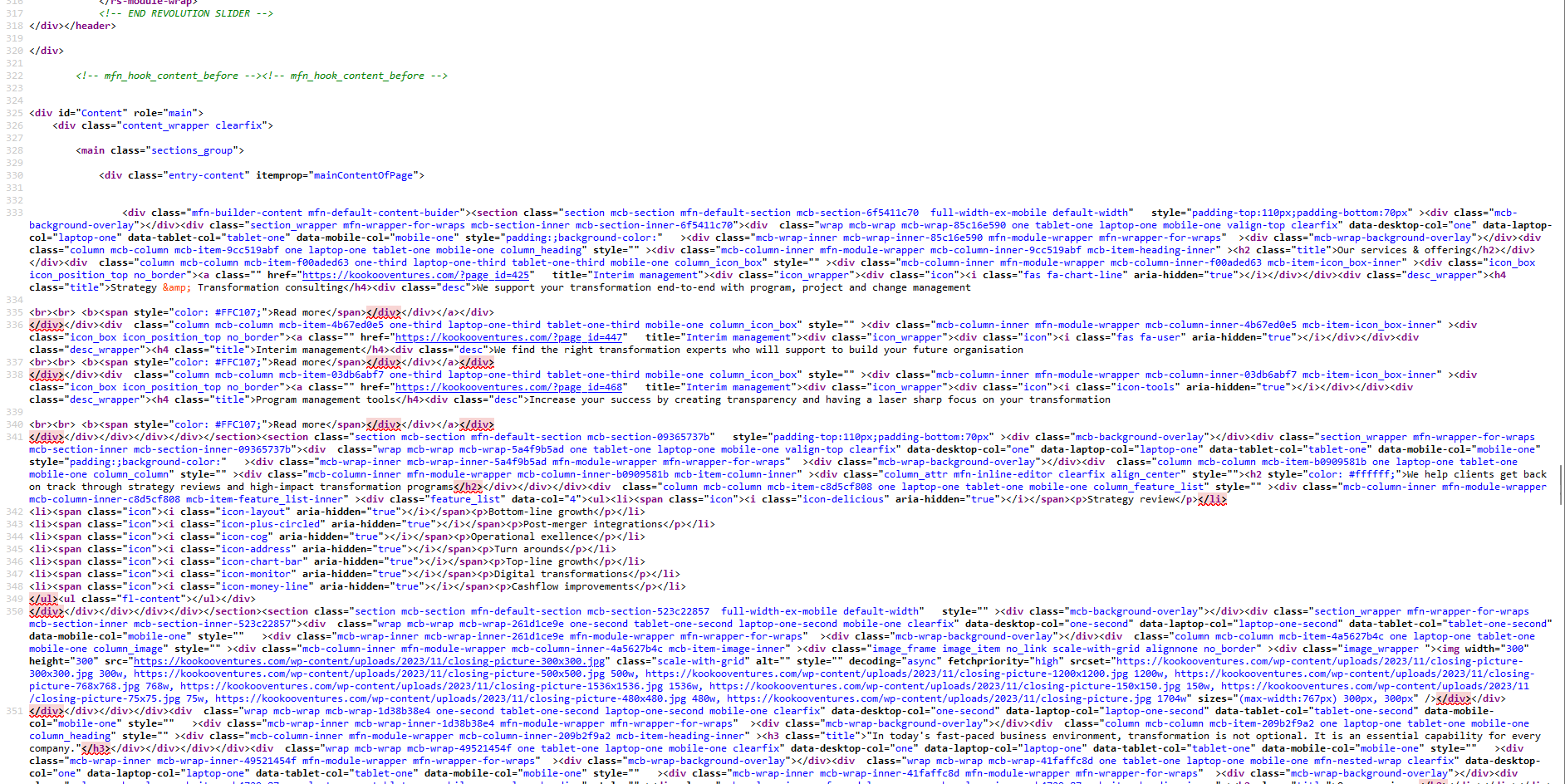I am encountering an issue with the BE Builder on my website, www.kookooventures.com, specifically with the "Feature List" pre-built section. The problem is evident in the section titled "We Specialize in High-Impact Transformations."