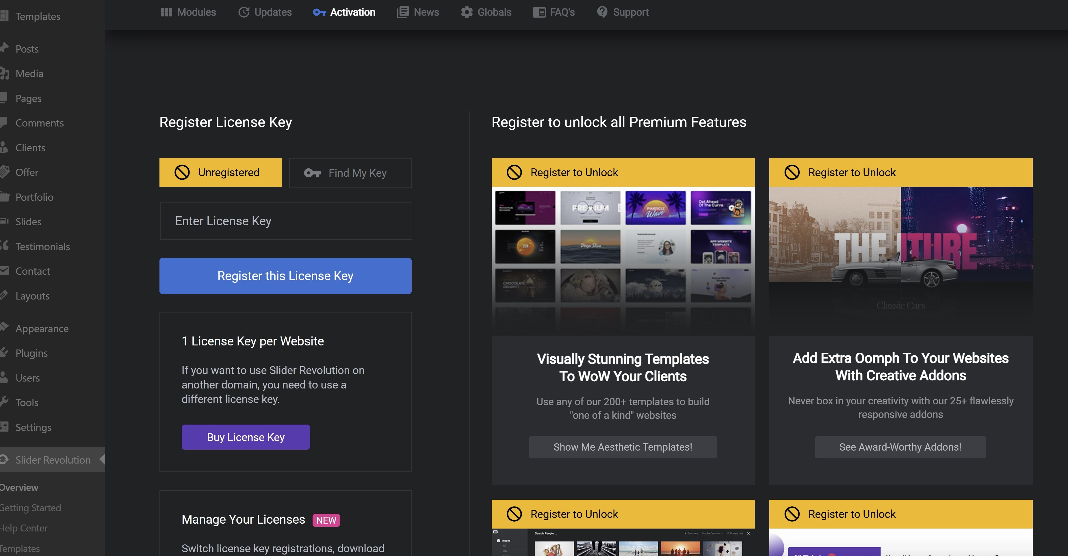 hello , when i go to Revolution slider , it says its unregistered and when i put the item purchase code in there it says invalid code