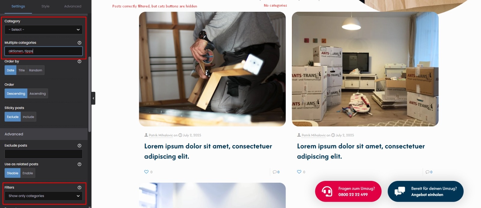 As soon as we fill in the “Multiple Categories” field with those three slugs, the filter buttons disappear, even though we selected “Show only categories” in the Filters dropdown. The post list filters correctly, but the category buttons are hidden from the frontend.