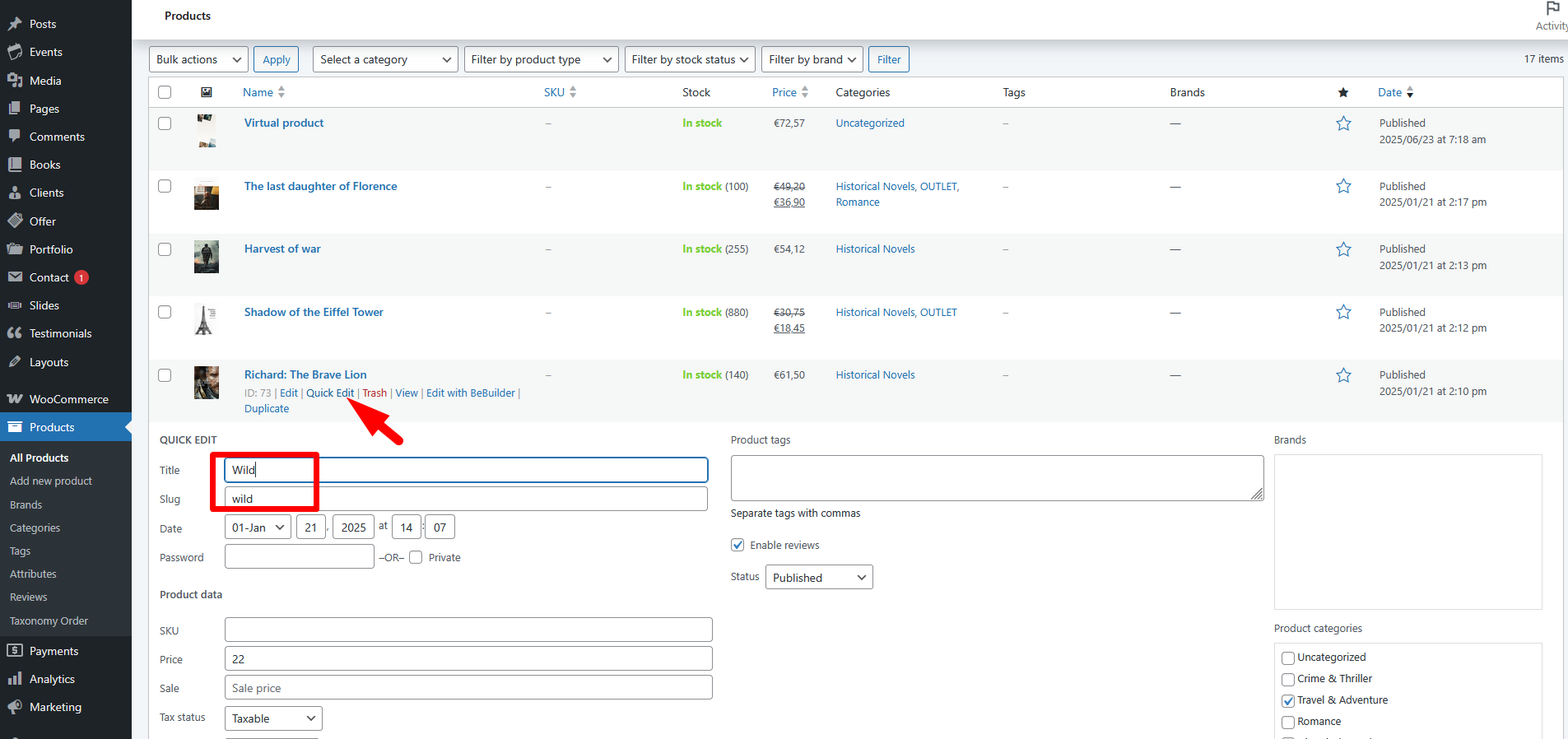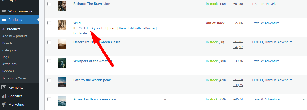 Go to Products tab in the WP panel, and you can either use quick edit or regular edit.