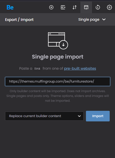 When pasting a link from one of the pre-built websites (e.g. BeFurnitureStore – Betheme, BeSnapshot – BeTheme), nothing is imported onto the builder page or shown in live previews. etc.