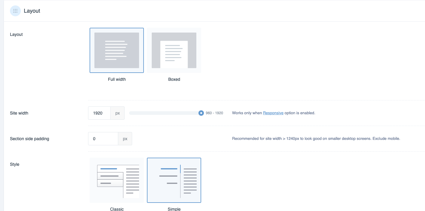 – Adjusted Site Width to 1920px, Section Padding to 0