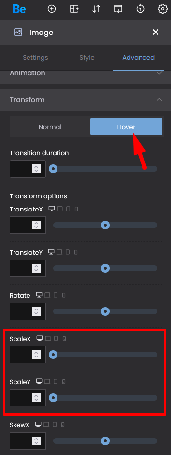 Go to the Advanced tab of the Image element, and set the ScaleX and ScaleY in the Transform tab for the hover state: