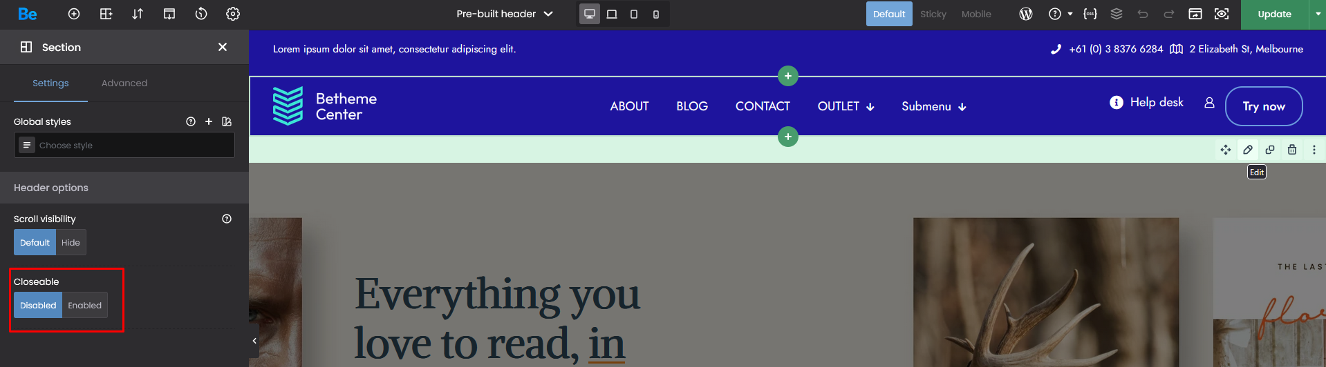 2) Edit your header template, and ensure that your section does not have the Closable option set to Enabled: