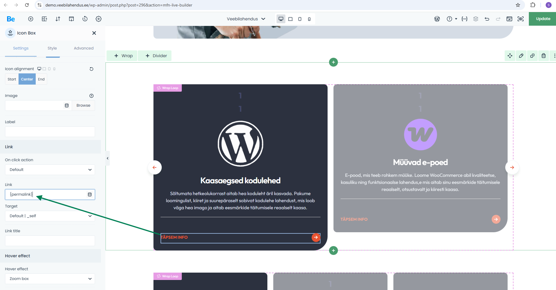 I’m using the Icon Box element, and in the link field I’ve added {permalink}.