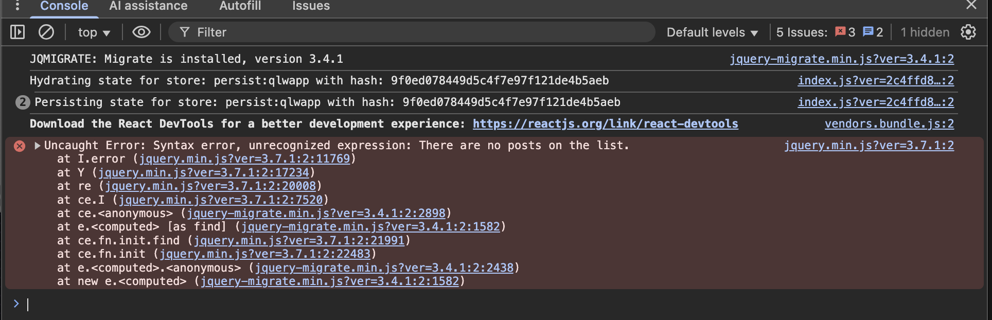 I tested the load more button and saw that the animation never stopped and the 4th blog article was never shown. In the dev tools I saw that an error was thrown (see attached image).