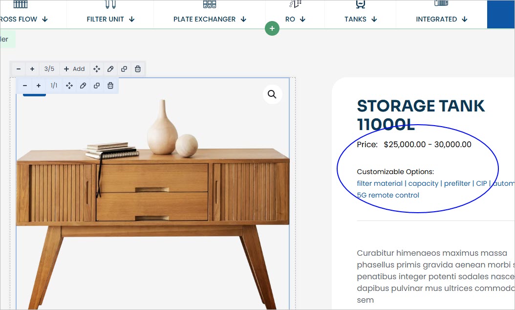 I am using 'Furniture' prebuilt demo for my website. I would like to set to product a price range as shown in the attached image and some very short description of that series of products. The original demo design uses a Woo Commerce dynamic data, which is too complex for me to figure how it works. So instead, I insert a 'plain text' element. As a result, it is fixed text, not changing when a product changes.