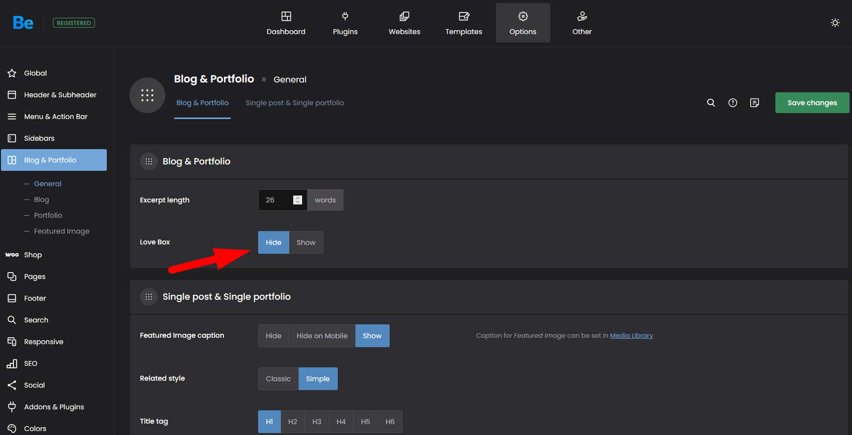 Go to Betheme -> Theme options -> Blog & Portfolio -> General, and set to hide the love box: