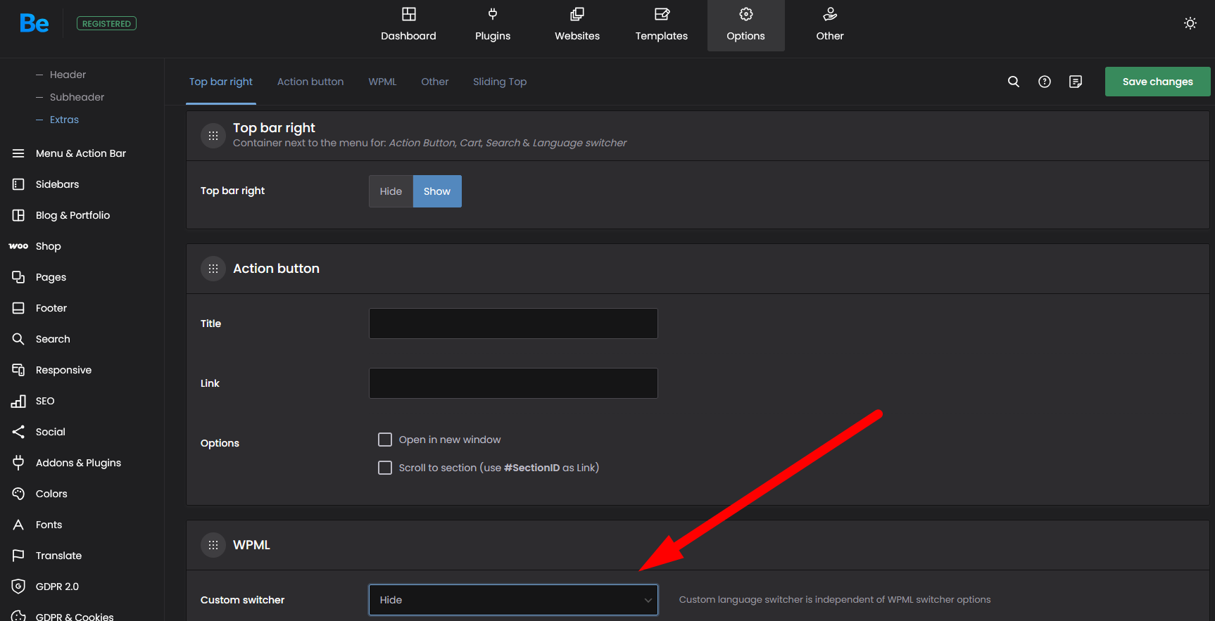 So if you want to hide the language switcher, go to Betheme -> Theme options -> Header & Subheader -> Extras, and change Custom switcher to Hide: