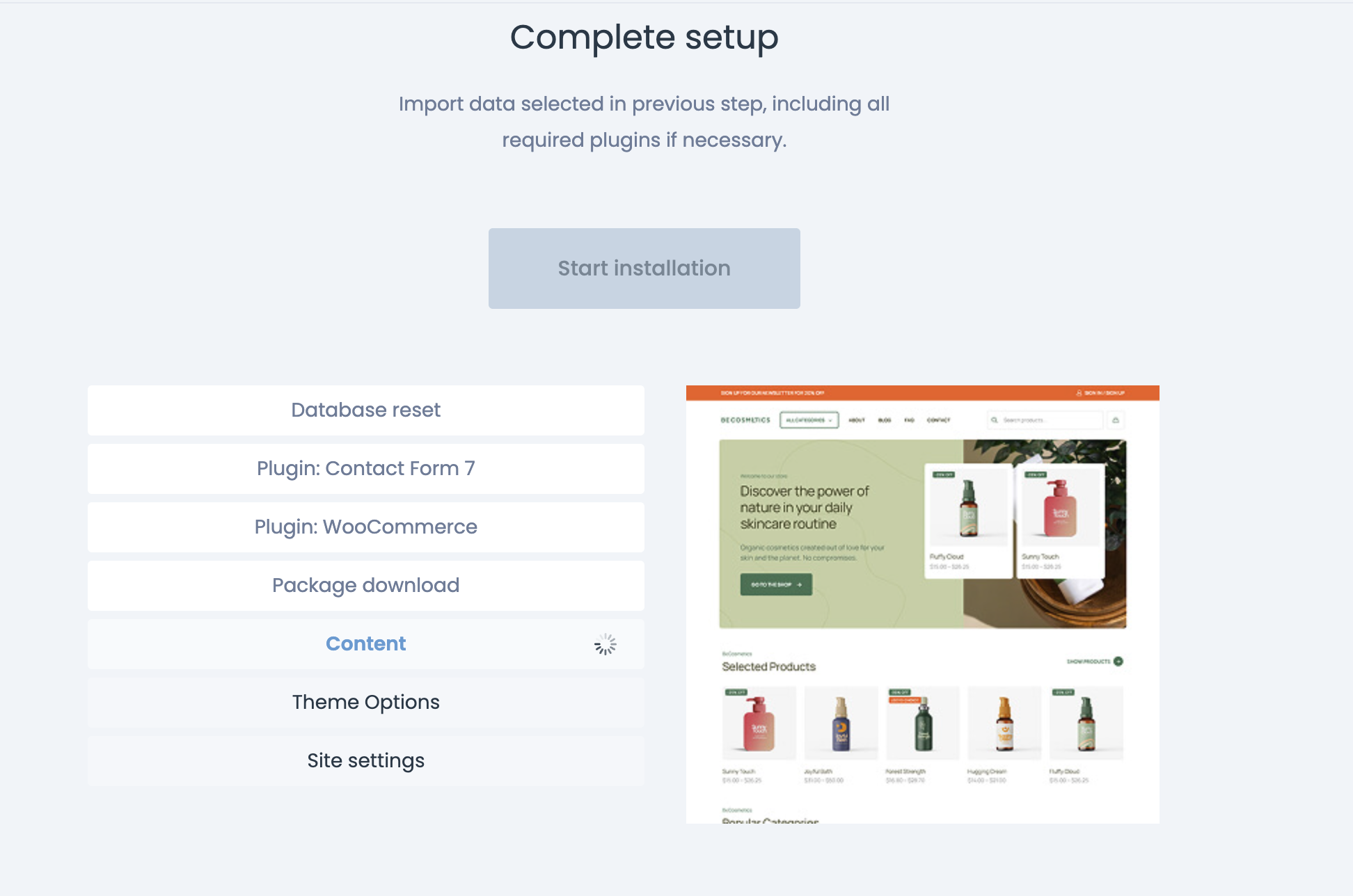 Hello, as with many other users while I am trying to install a prebuilt website the progress stops at "content". Can you please suggest a solution; Just bought the theme yesterday and is up to date.