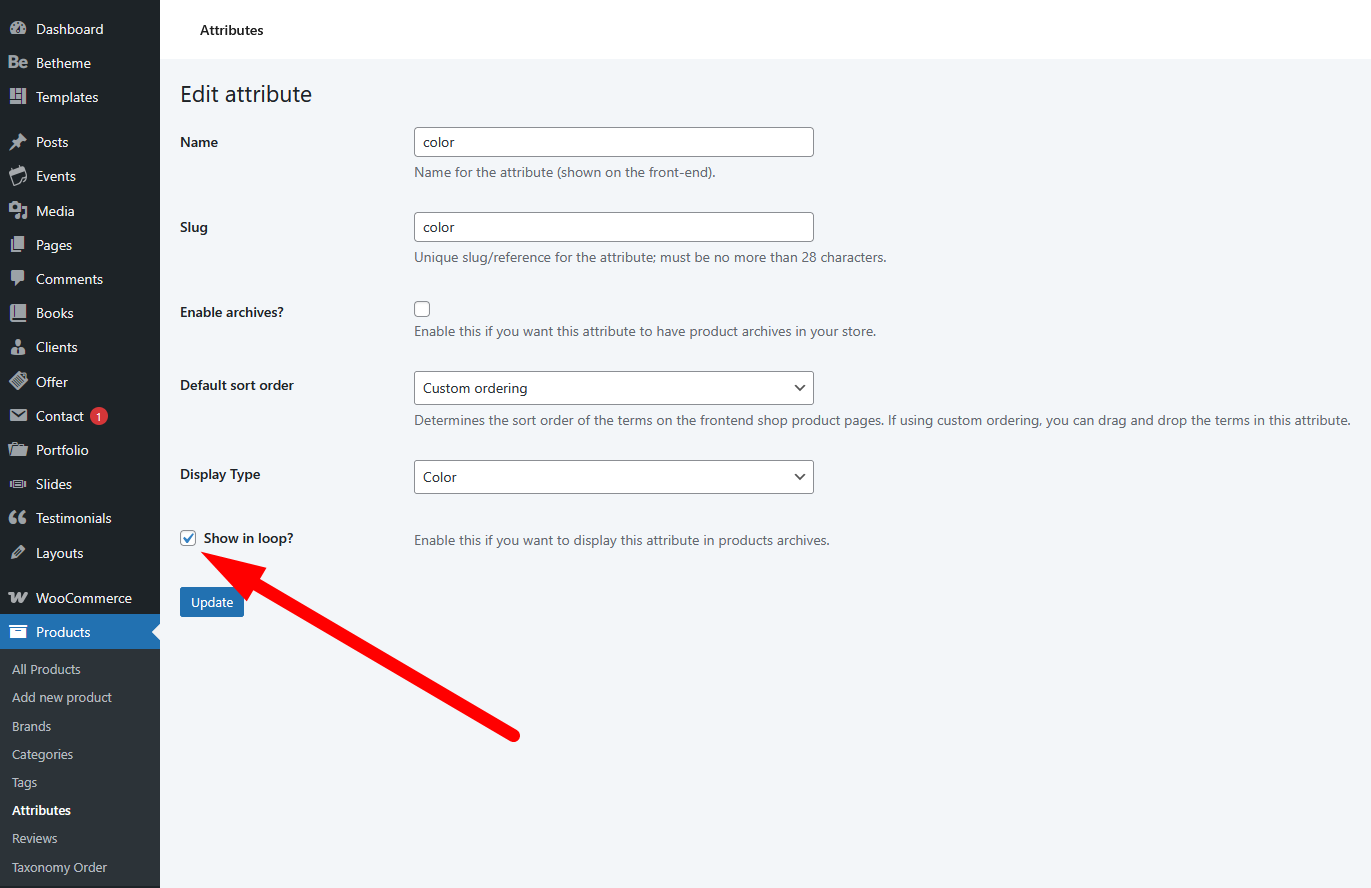 If the attribute is created this way, there are no settings to control it, and it might be the reason why it displays in the shop element.