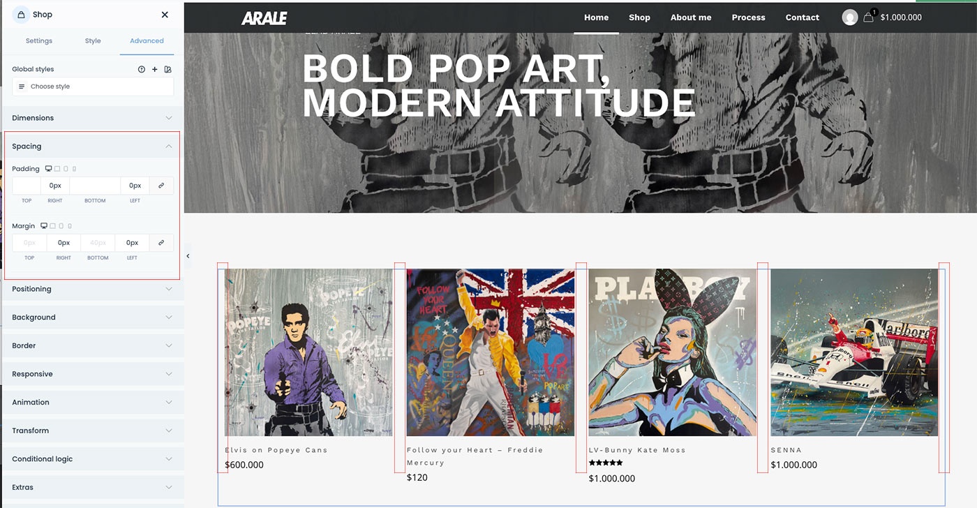 Products in the shop element have a pre-defined margin, which you can overwrite using the following CSS code: