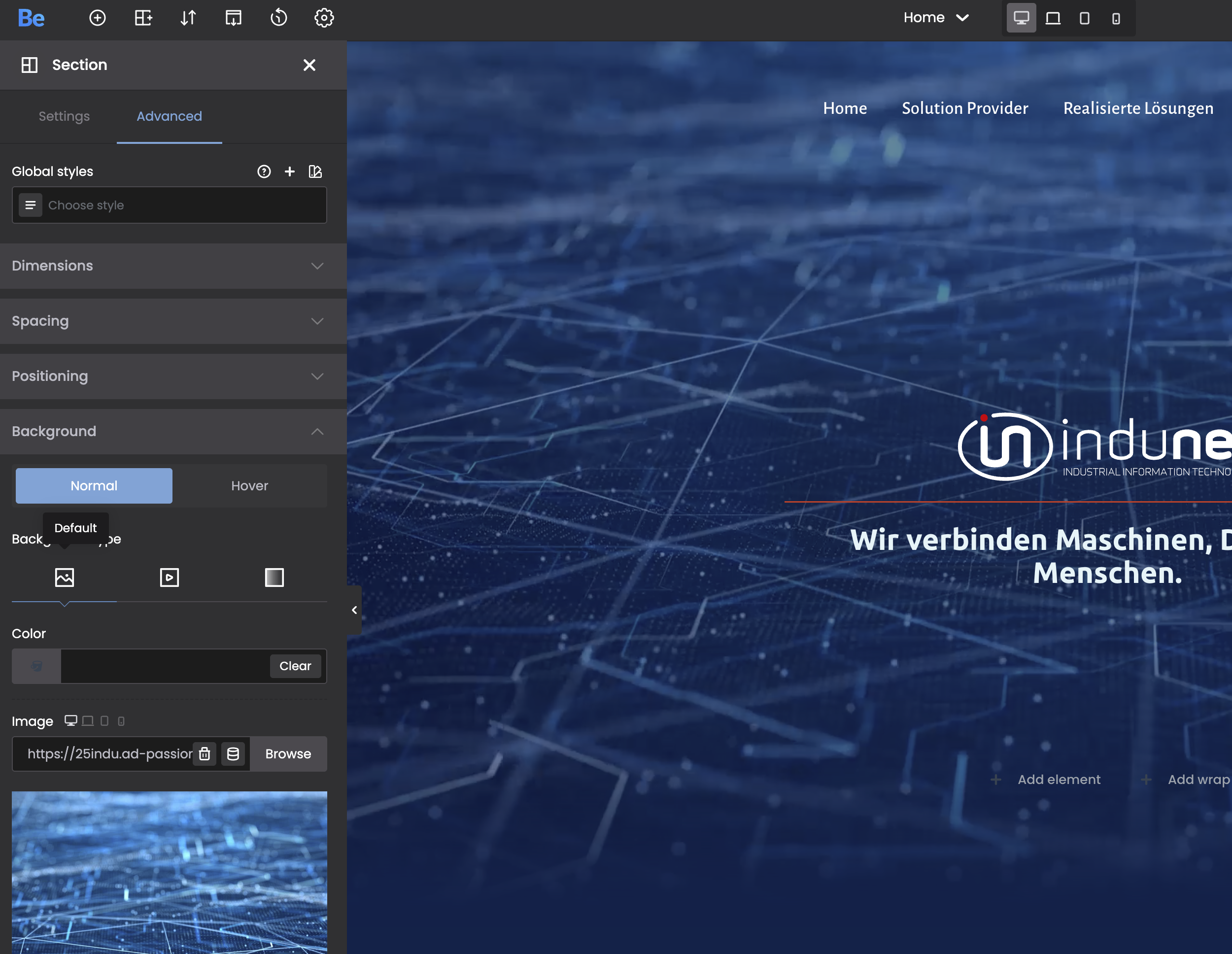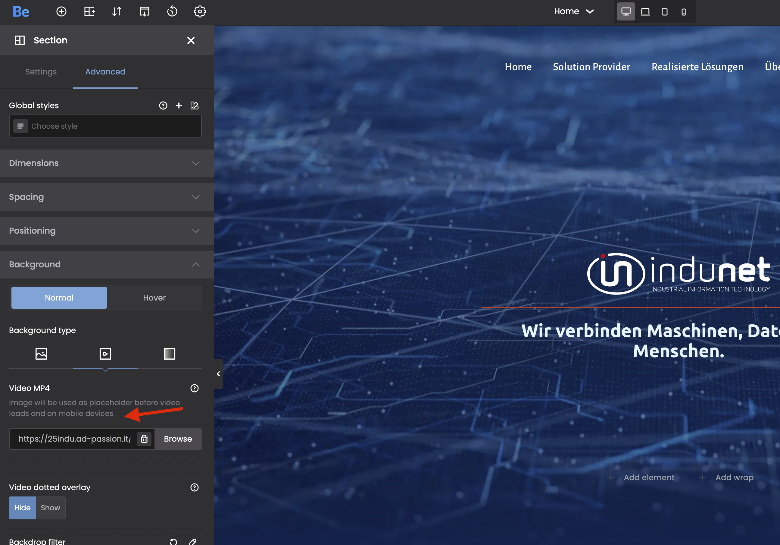 But for the final website it would be better to include a video from vimeo, which is more flexible and has a lower impact on page loading. But there is no option for that. If I insert the video/vimeo elment, it's an element, not the full-width-window-section. How to insert vimeo directly in the section settings?