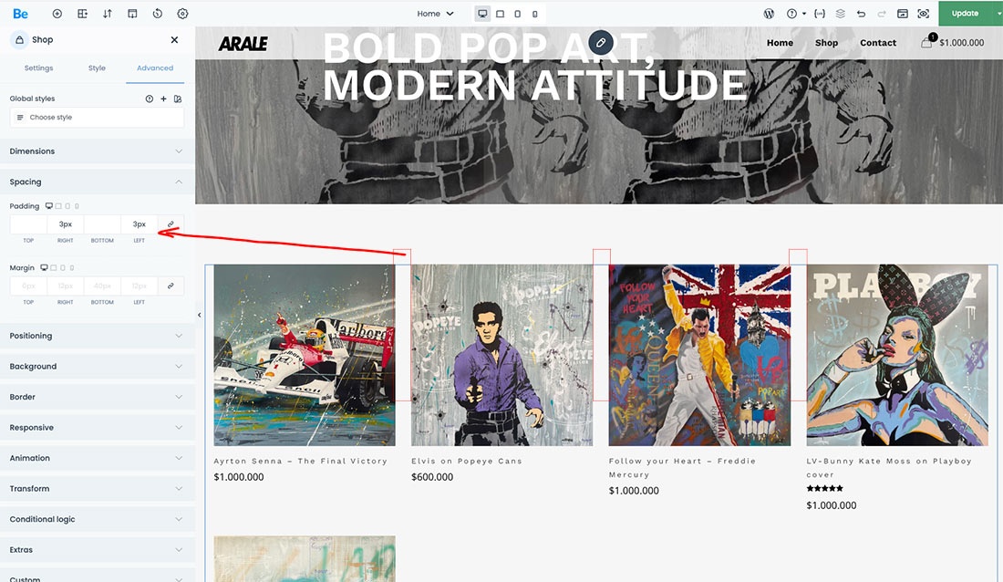 PS. In the Advanced tab, you set padding to the entire shop element, it does not control spaces between products inside.