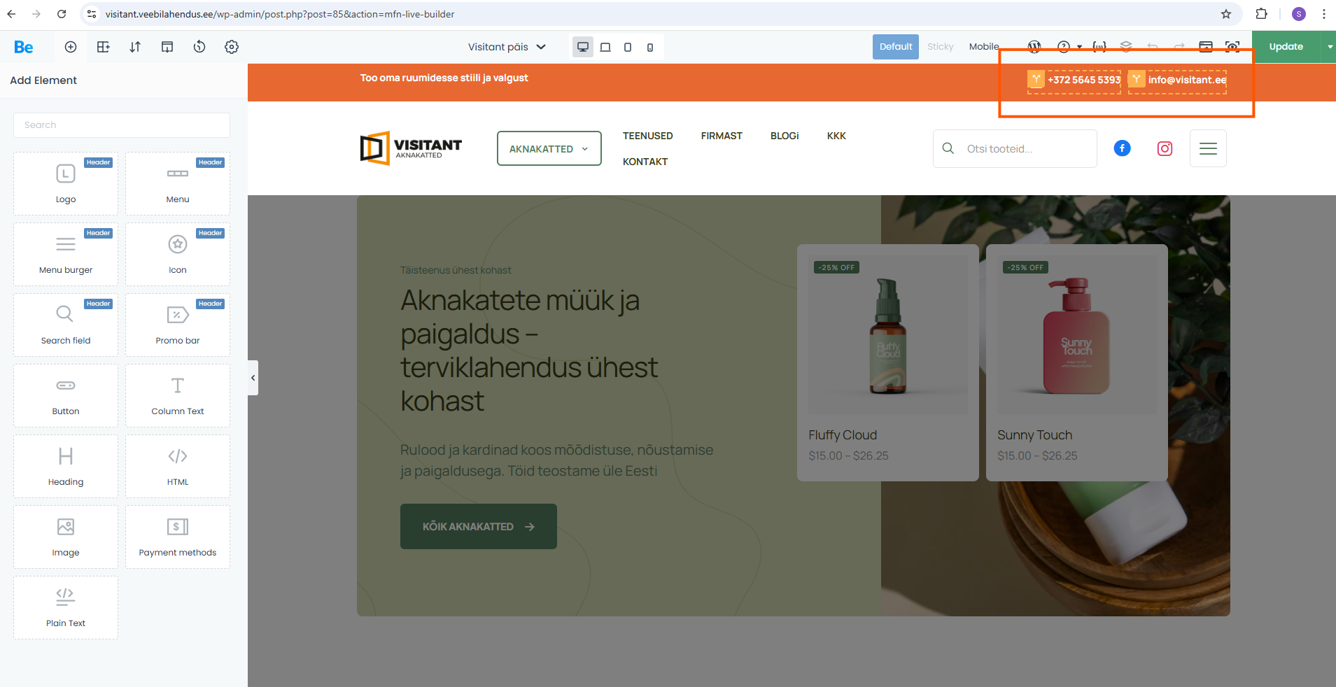 Phone number visible in admin but not on live site