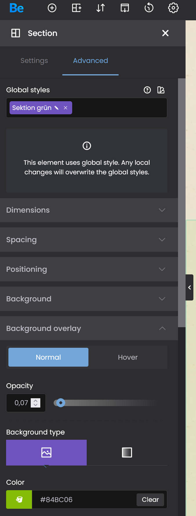I am defining a global style for a section. Here, I set a background overlay with a color and an opacity of 0.05. See image 1.