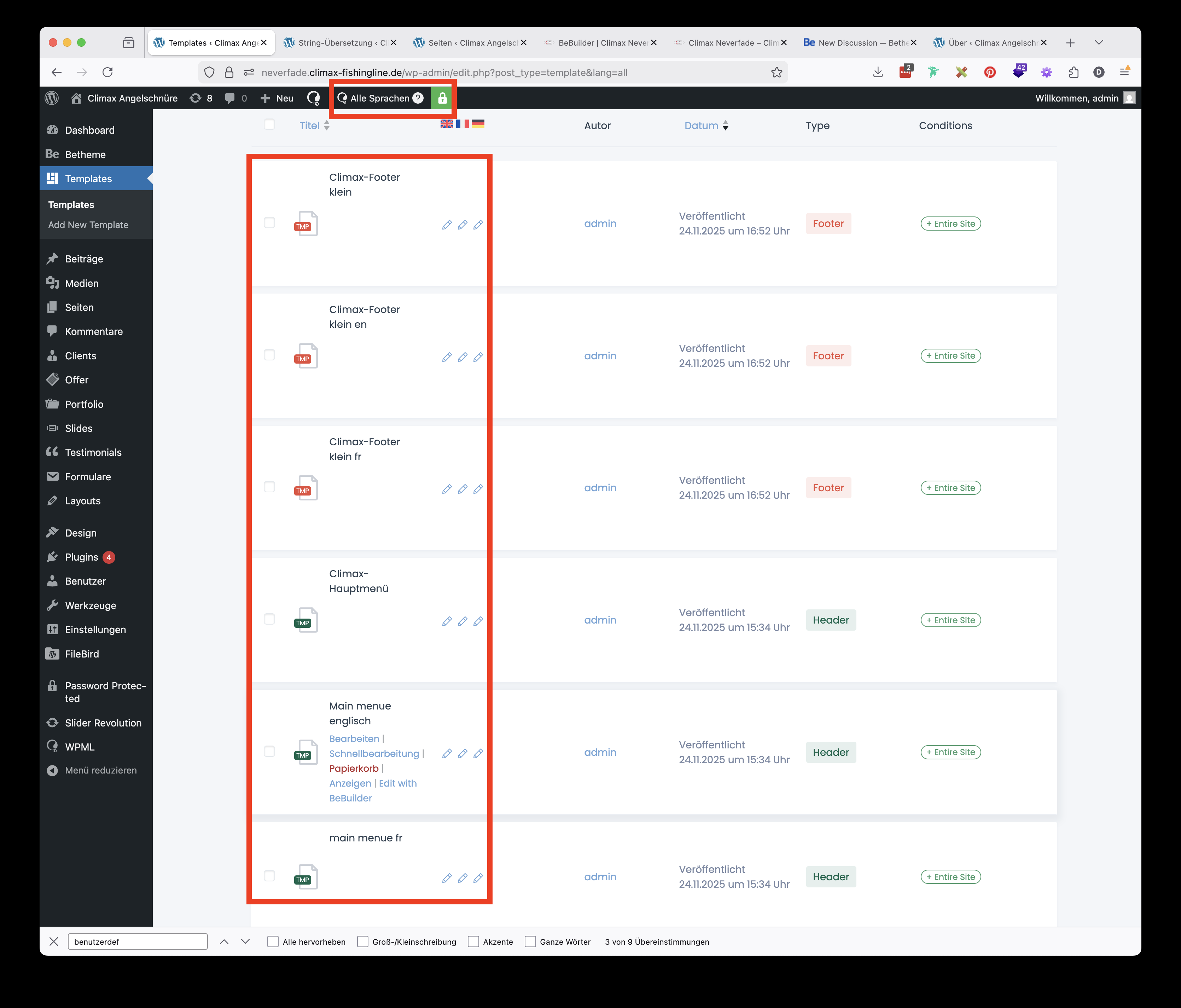 But in French and English I get the standard menu and footer of the Prebuilt-Theme: