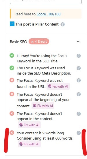 Additionally, Rank Math believes the page only has 9 words.