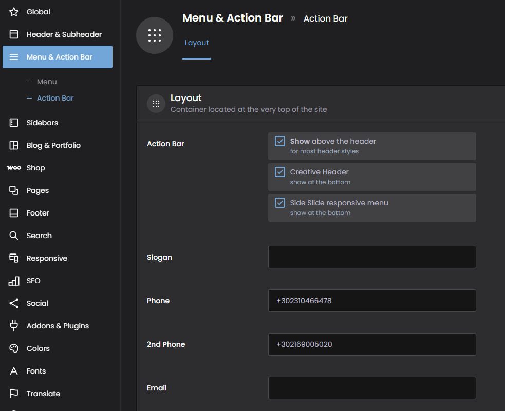 I have activated the action bar on settings, but the phones are shown inside the side menu. I would like them to be on a full width bar above the whole page, so they are more visible (desktop and mobile).