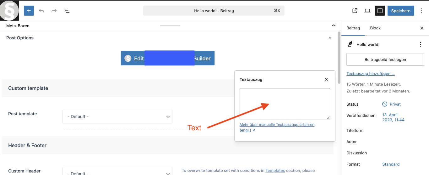 I have a quick question about Bebuilder. In the normal WordPress editor, you can enter a text excerpt in the backend in the right sidebar under “Post,” which is then displayed on the preview page instead of the normal text in the post. I have attached a screenshot for this. Where can I find this option in Bebuilder?