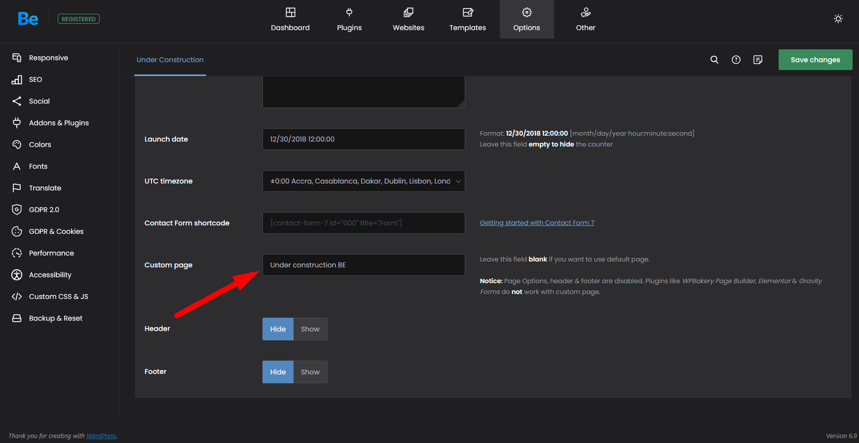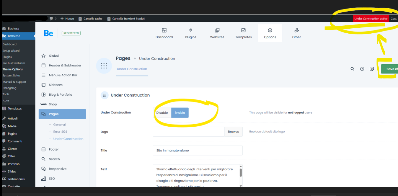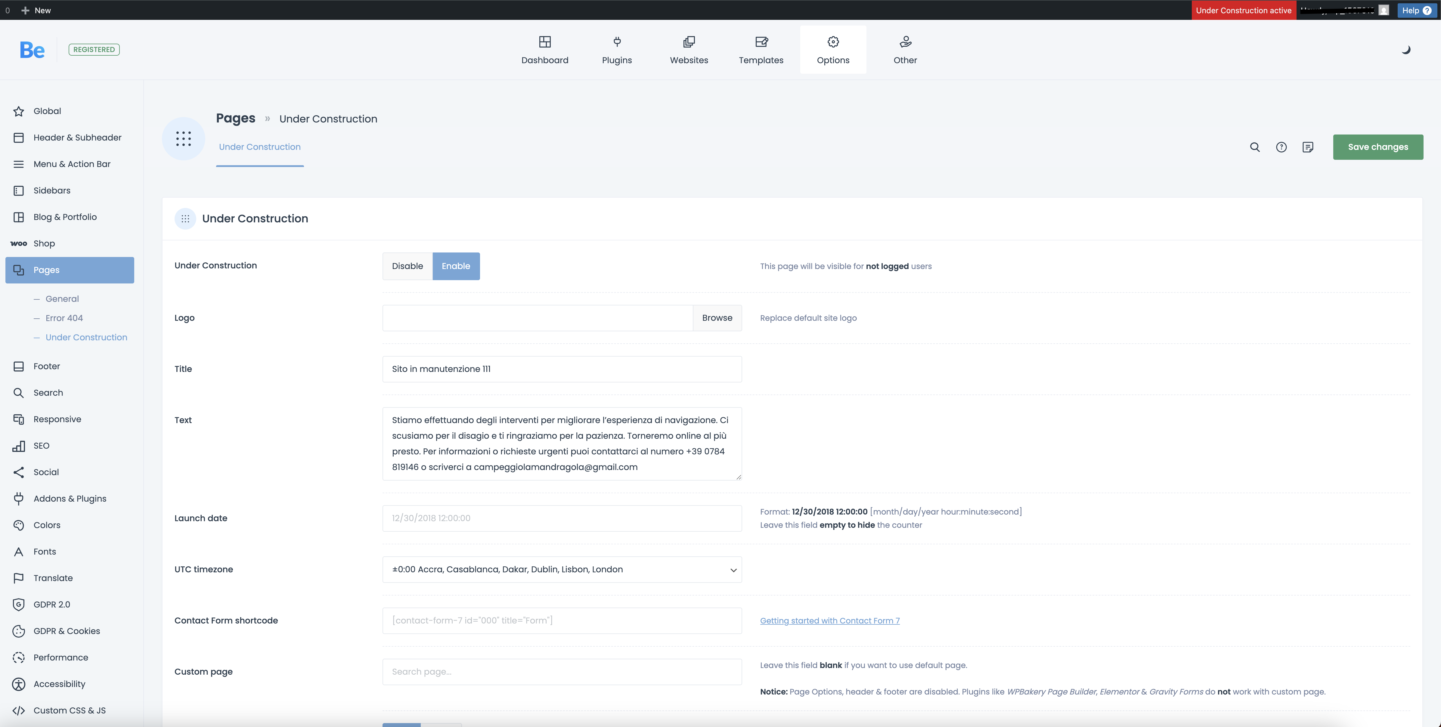 Now, if the cache is disabled, please check in Betheme -> Theme options -> Pages -> Under Construction, if a custom page is not selected there: