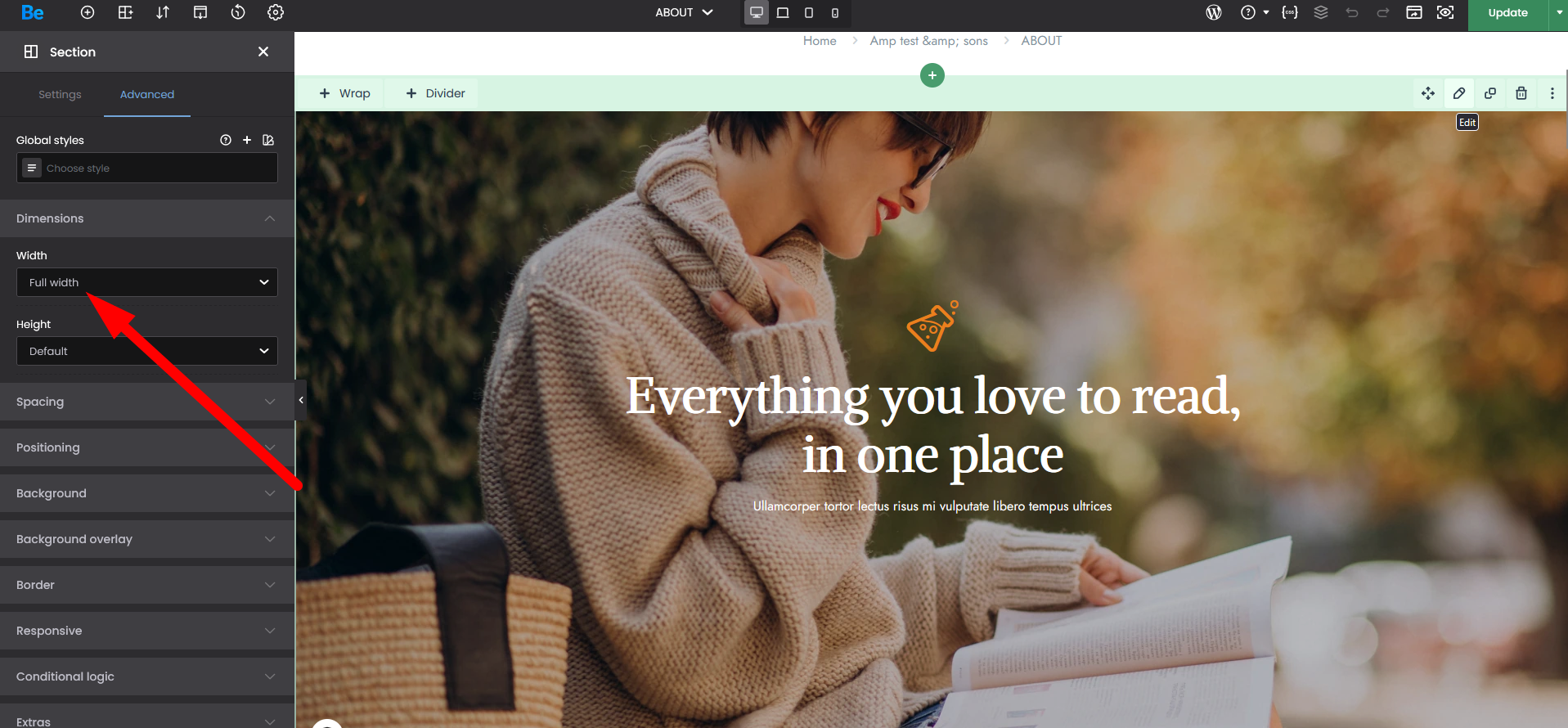 Full width can be enabled in the Section's advanced settings: