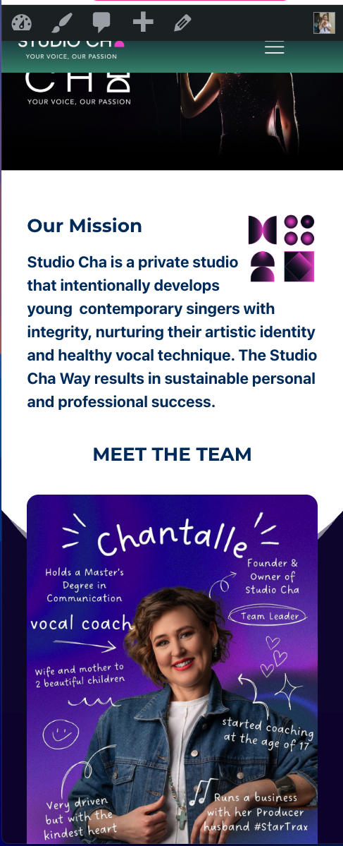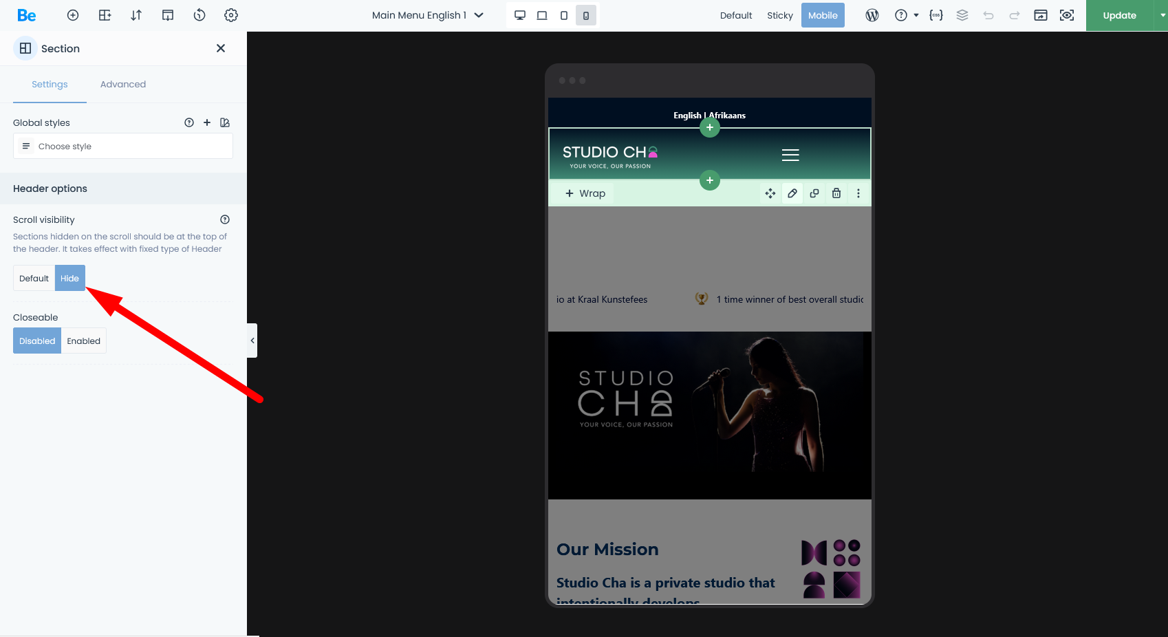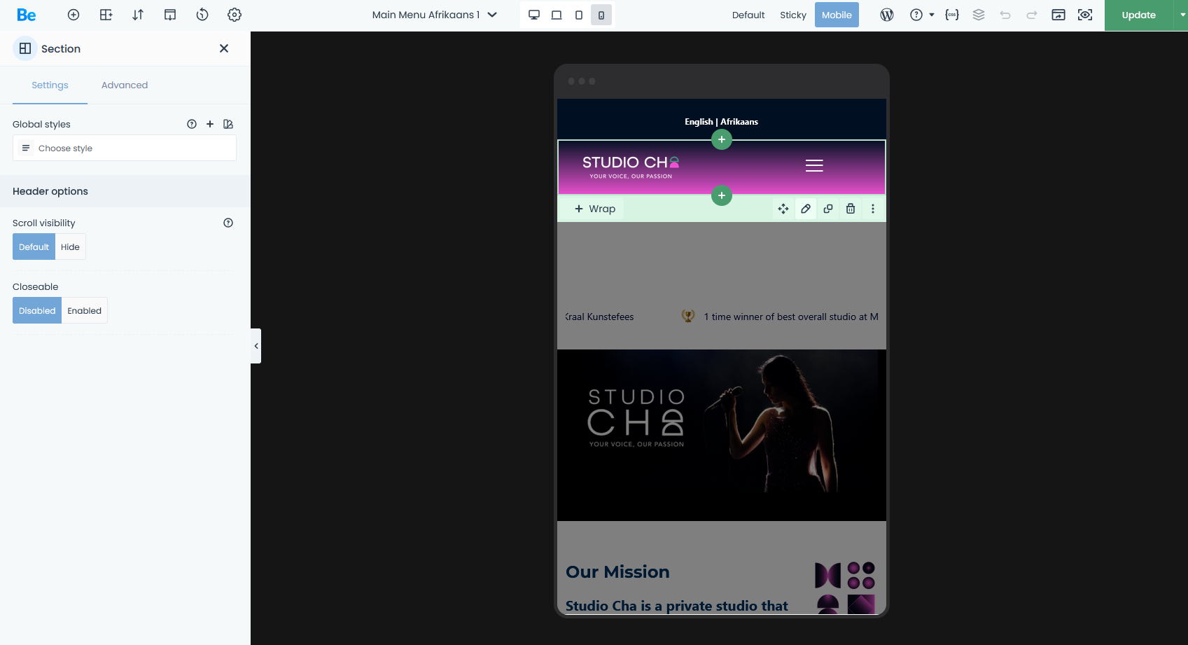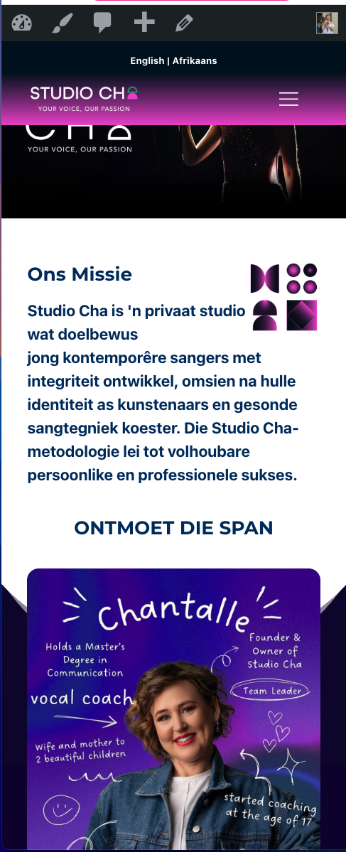 - https://studiocha.co.za/ - mobile header template made the same way for English and Afrikaans language options but the English (green header template) is not doing what it should do on mobile, the menu template dissapears as you scroll and it is SET TO FIXED in teh same way we set the AFRIKAANS MENU (pink)
