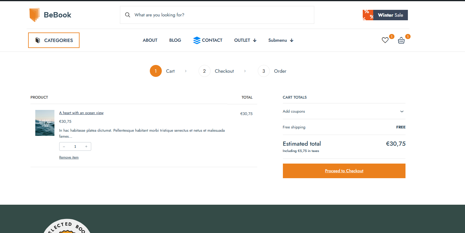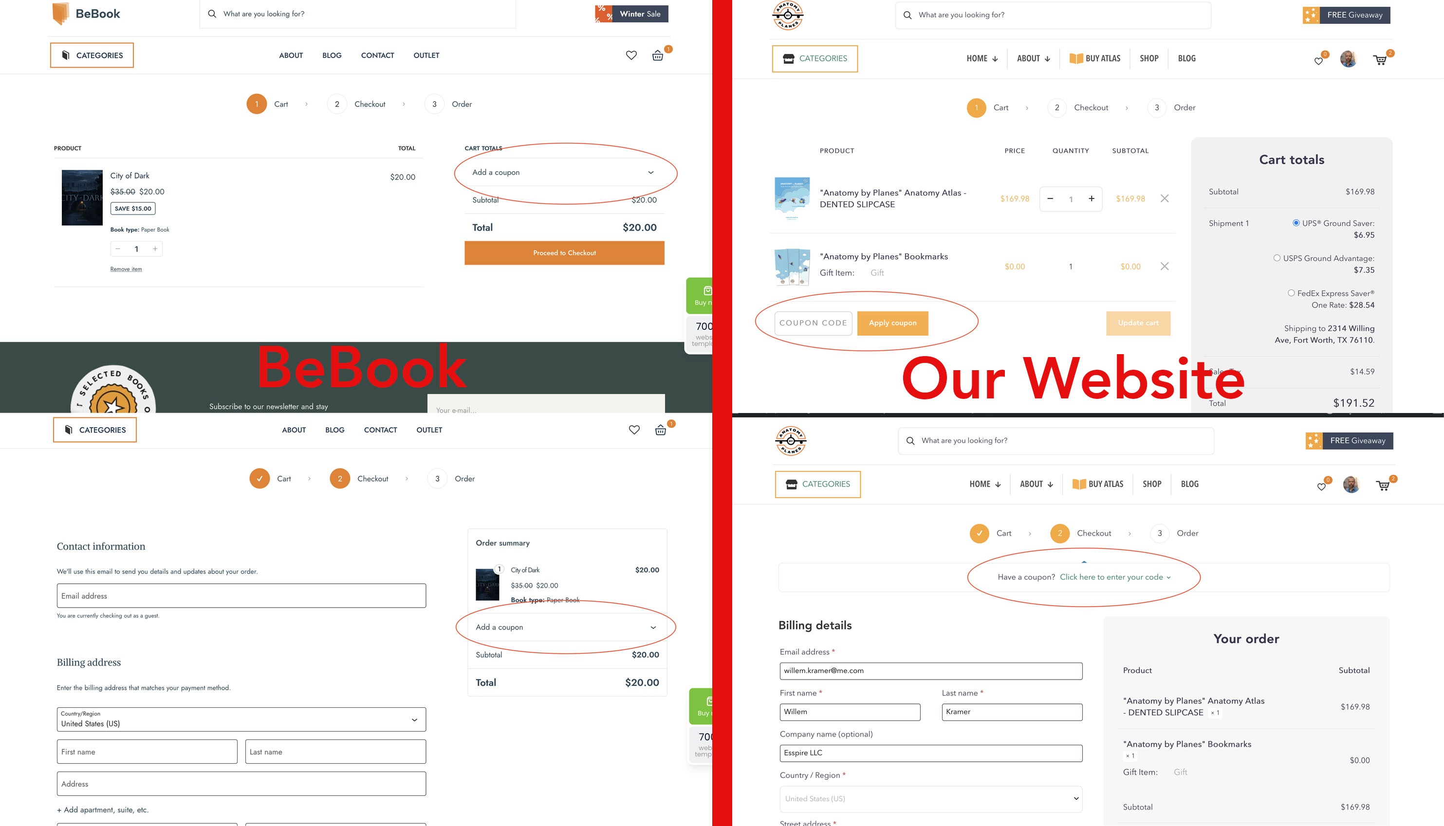 The "add a coupon" button and field on our website look different and are located in a different place than on the BeBook demo website.