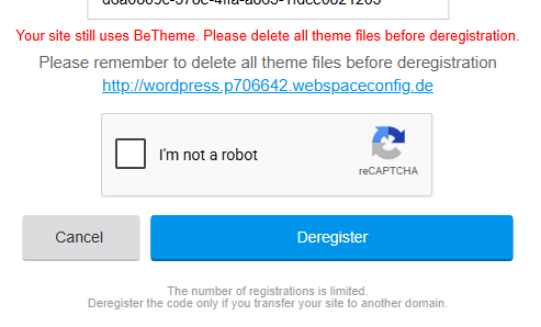 I am unable to de-register theme from http://api.muffingroup.com/licenses/ on wordpress.p706642.webspaceconfig.de and re-register it at https://www.stroex.media/ as it shows the theme files are still being used, however I complelty removed the theme from staging now and changed the theme. Still the same error.