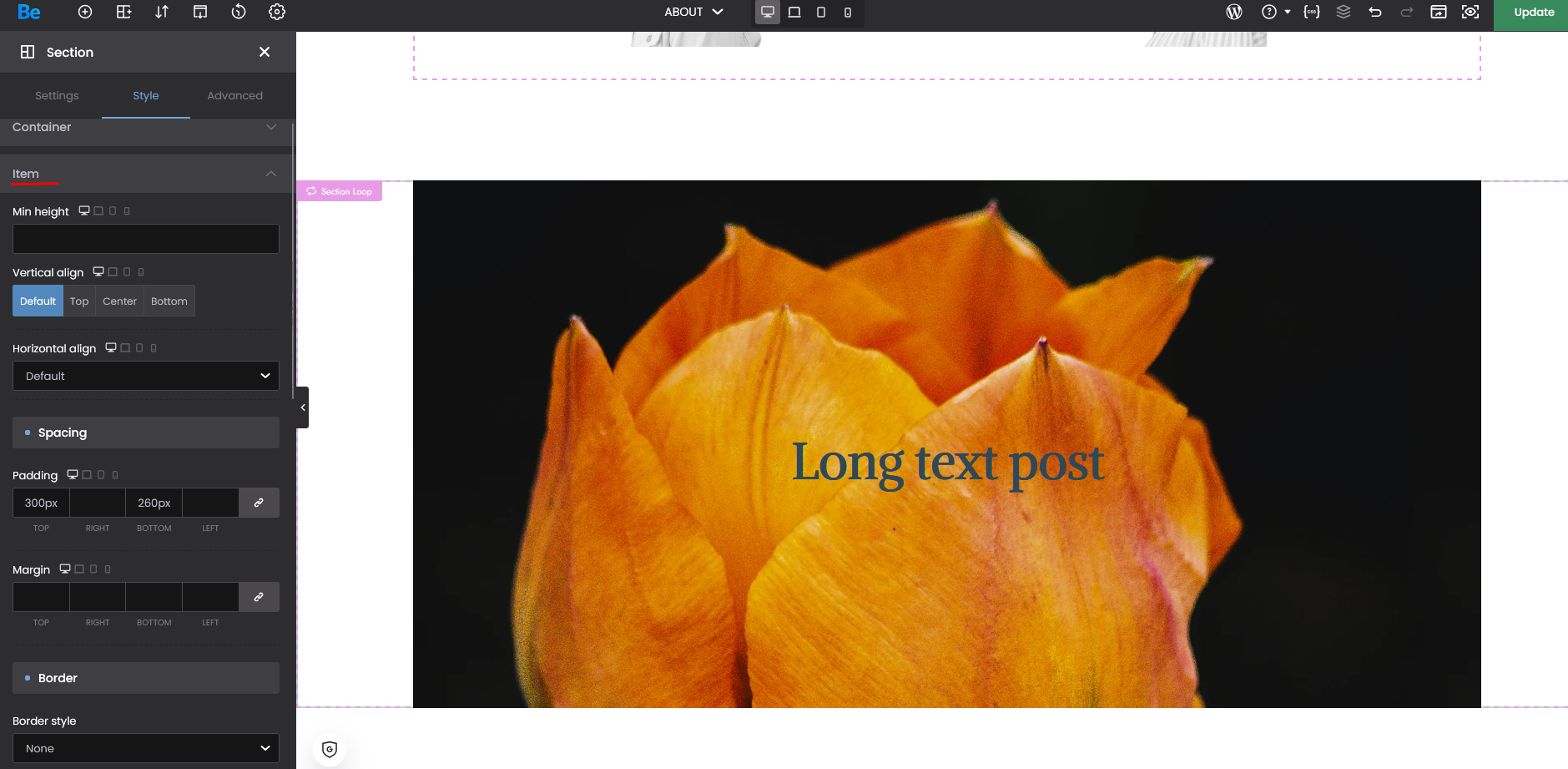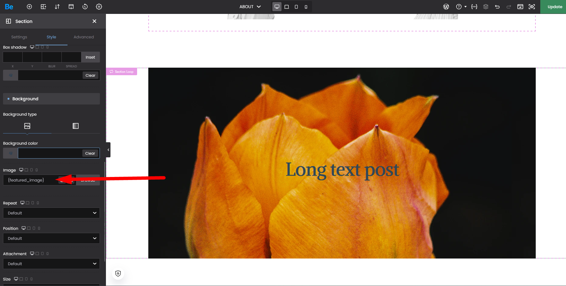 section loop / dynamic background image {featured_image}