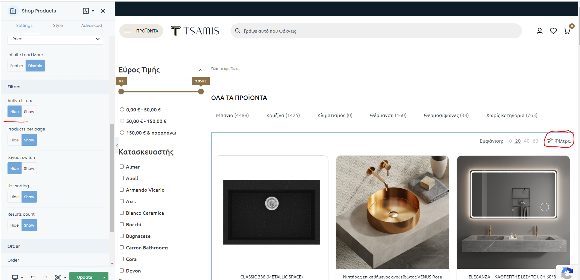 I cannot hide the active filters button using Shop Products module in a template