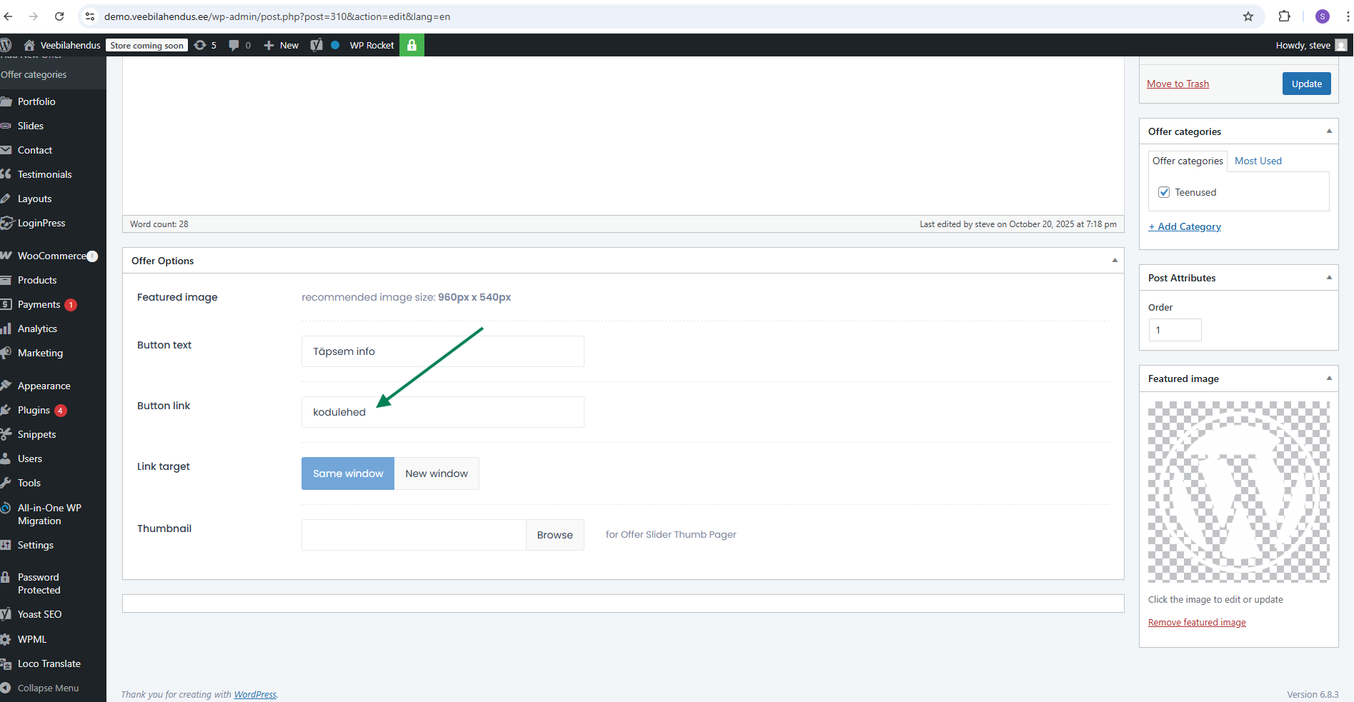 ,but still directs to homepage after click on button that shows: https://demo.veebilahendus.ee/?offer=kodulehed