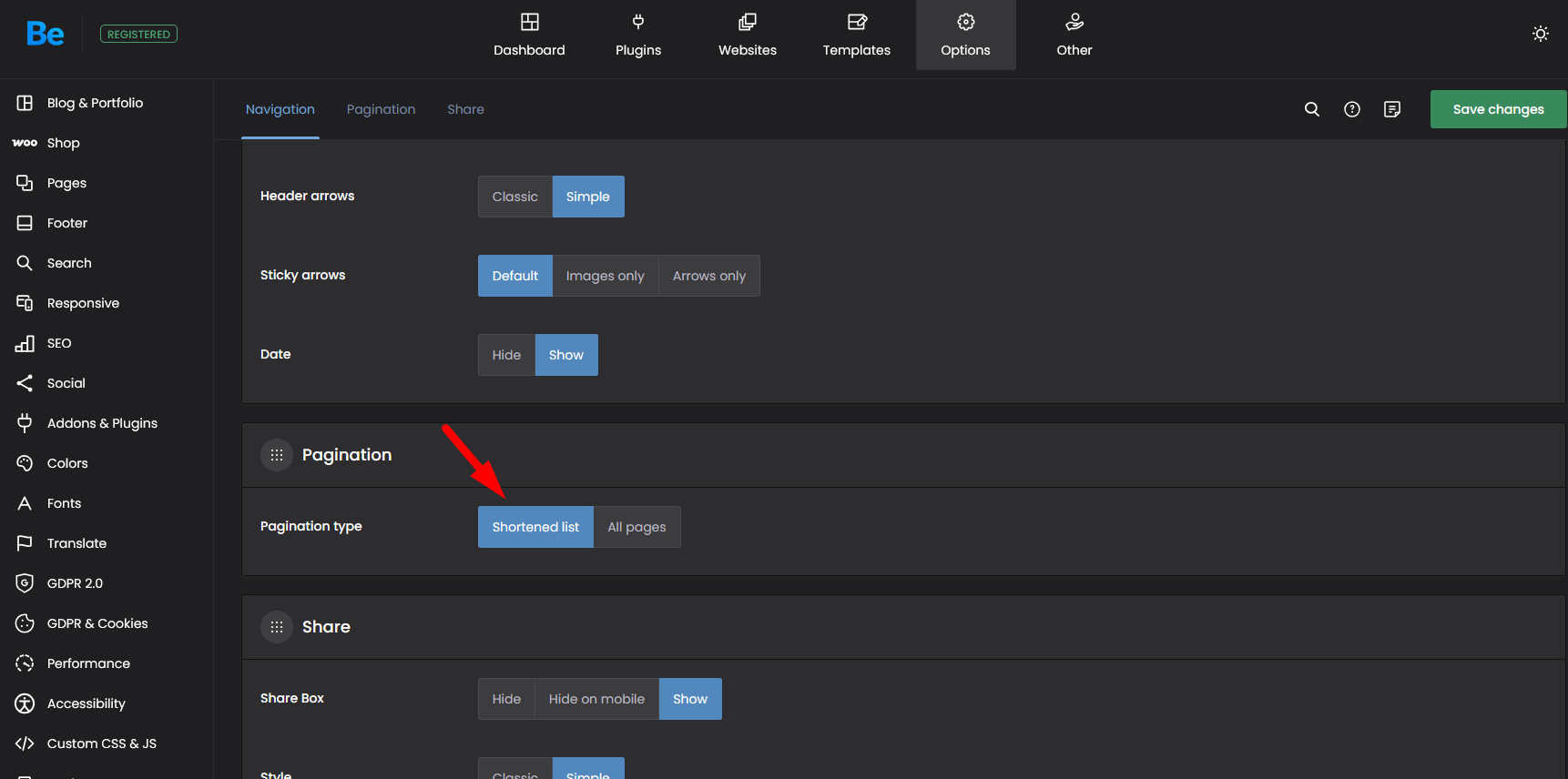 Please go to Betheme -> Theme options -> Global -> Navigation & Share, and change Pagination type to Shortened list: