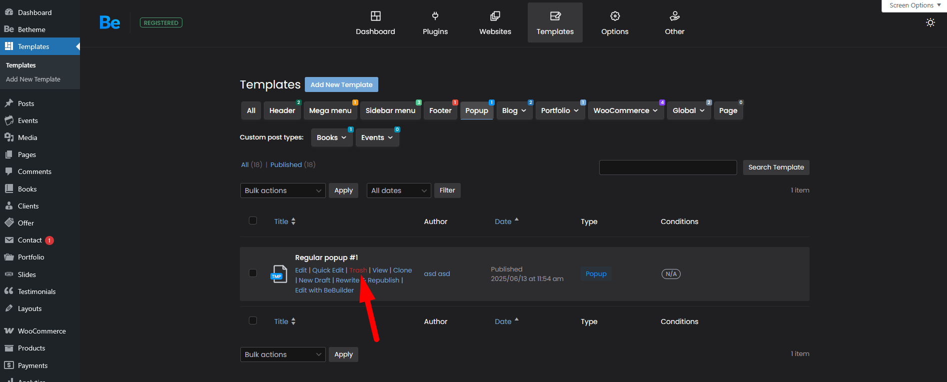 2) To remove the newsletter popup, go to Templates -> Popup, and trash this popup: