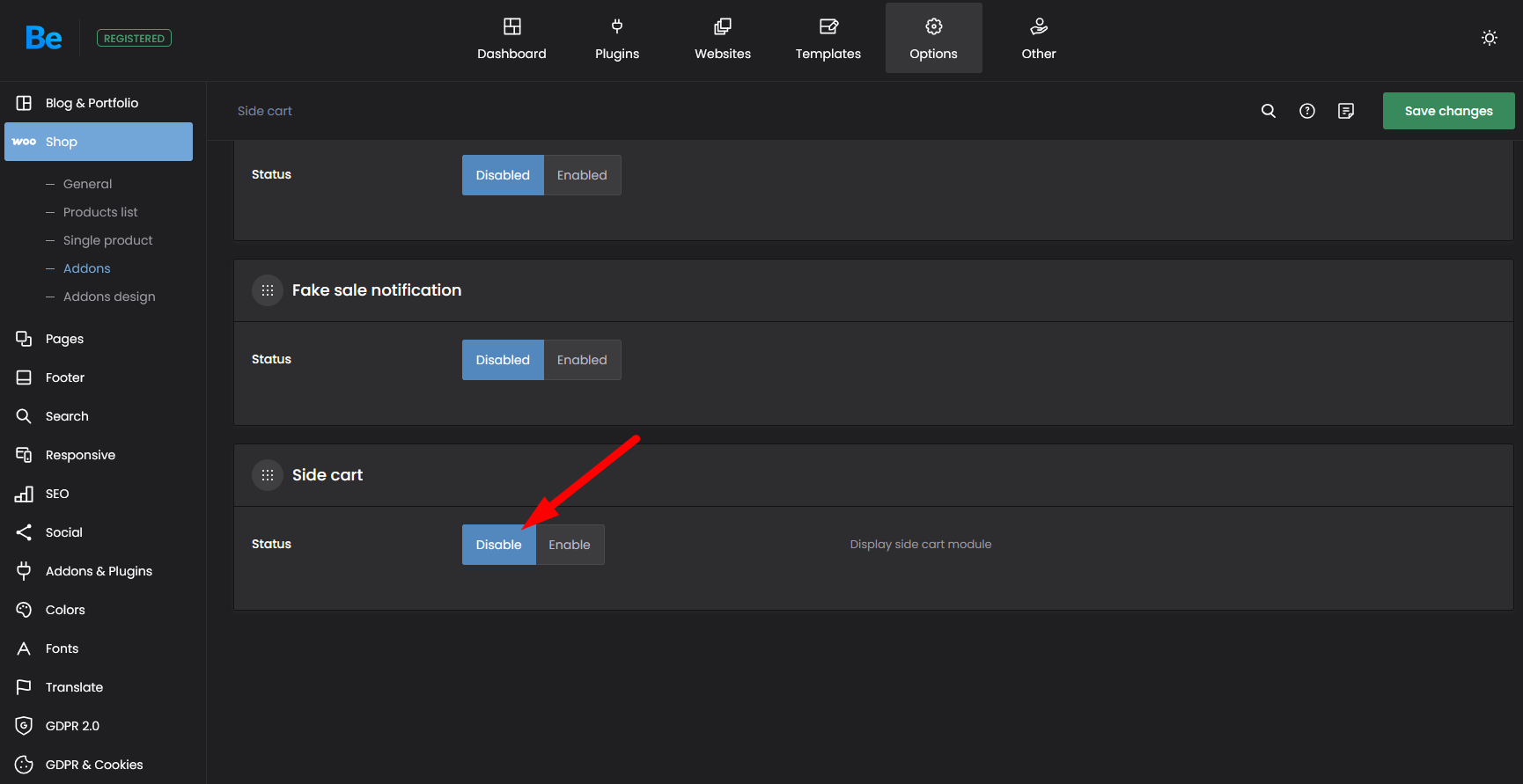 You can turn off the Side cart in Betheme -> Theme options -> Shop -> Addons: