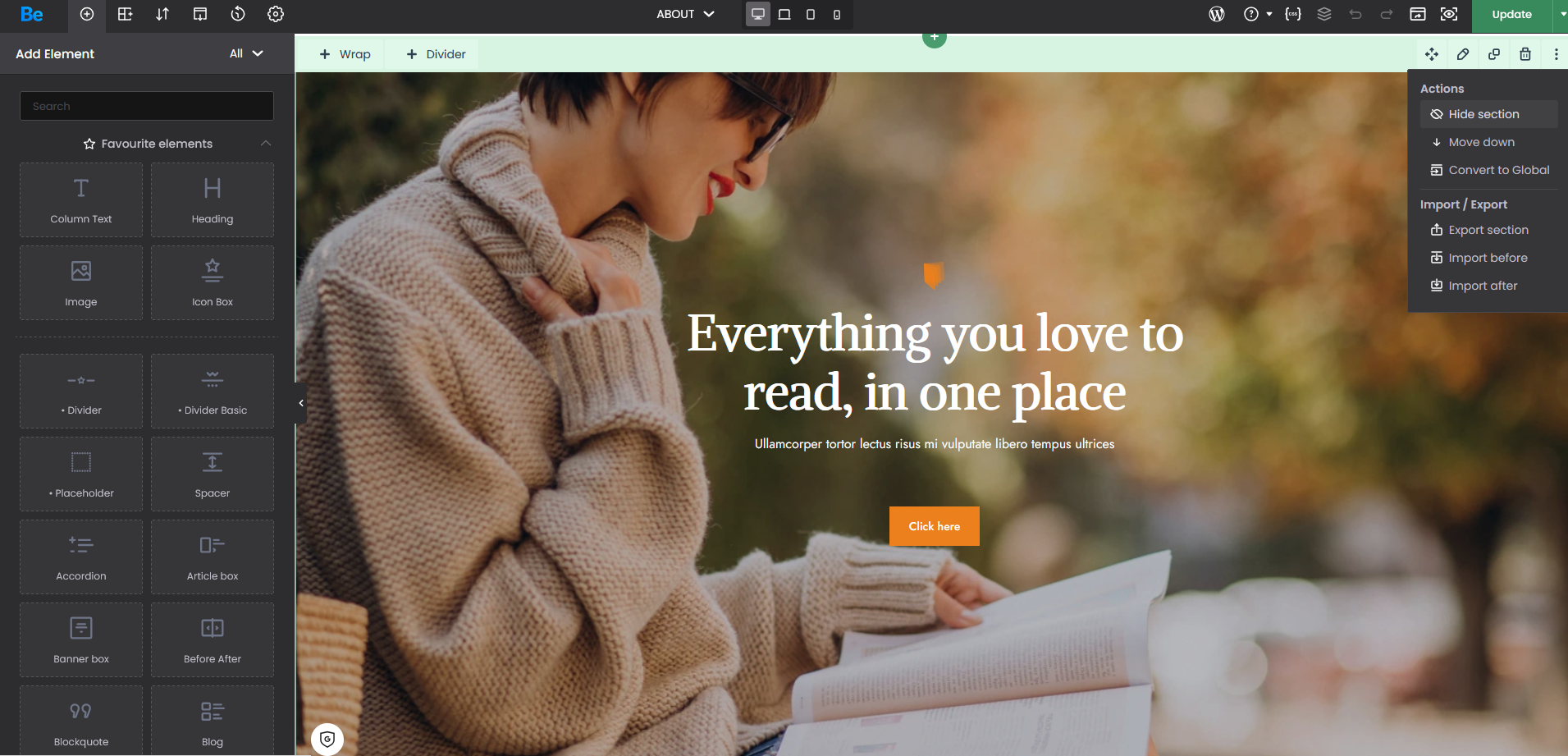 The only option to have content visible in the BeBuilder but not in the live page is available in the section options, and you can hide an entire section: