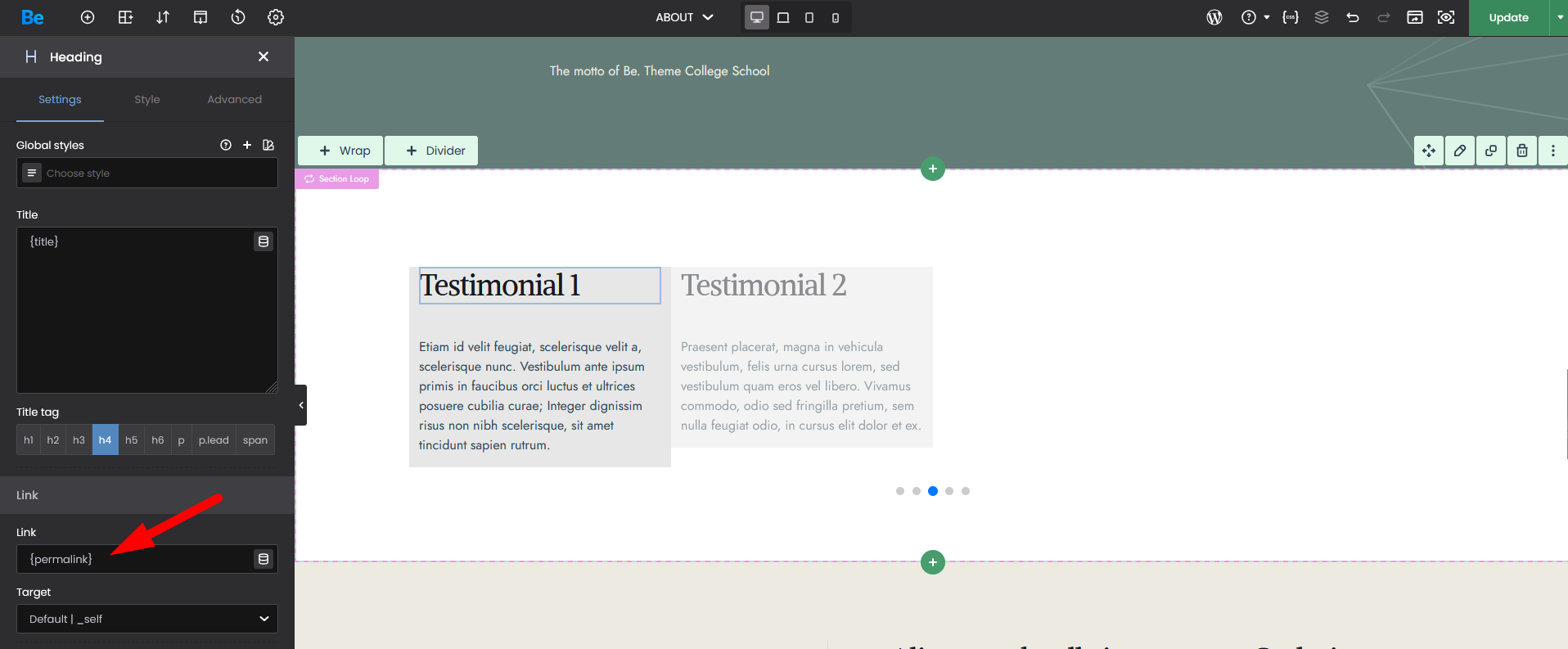 Another thing. At the loop section, i want that when the people click on the title or the image they go to the page. I don't want the link only at the arrow. How can i do this?
