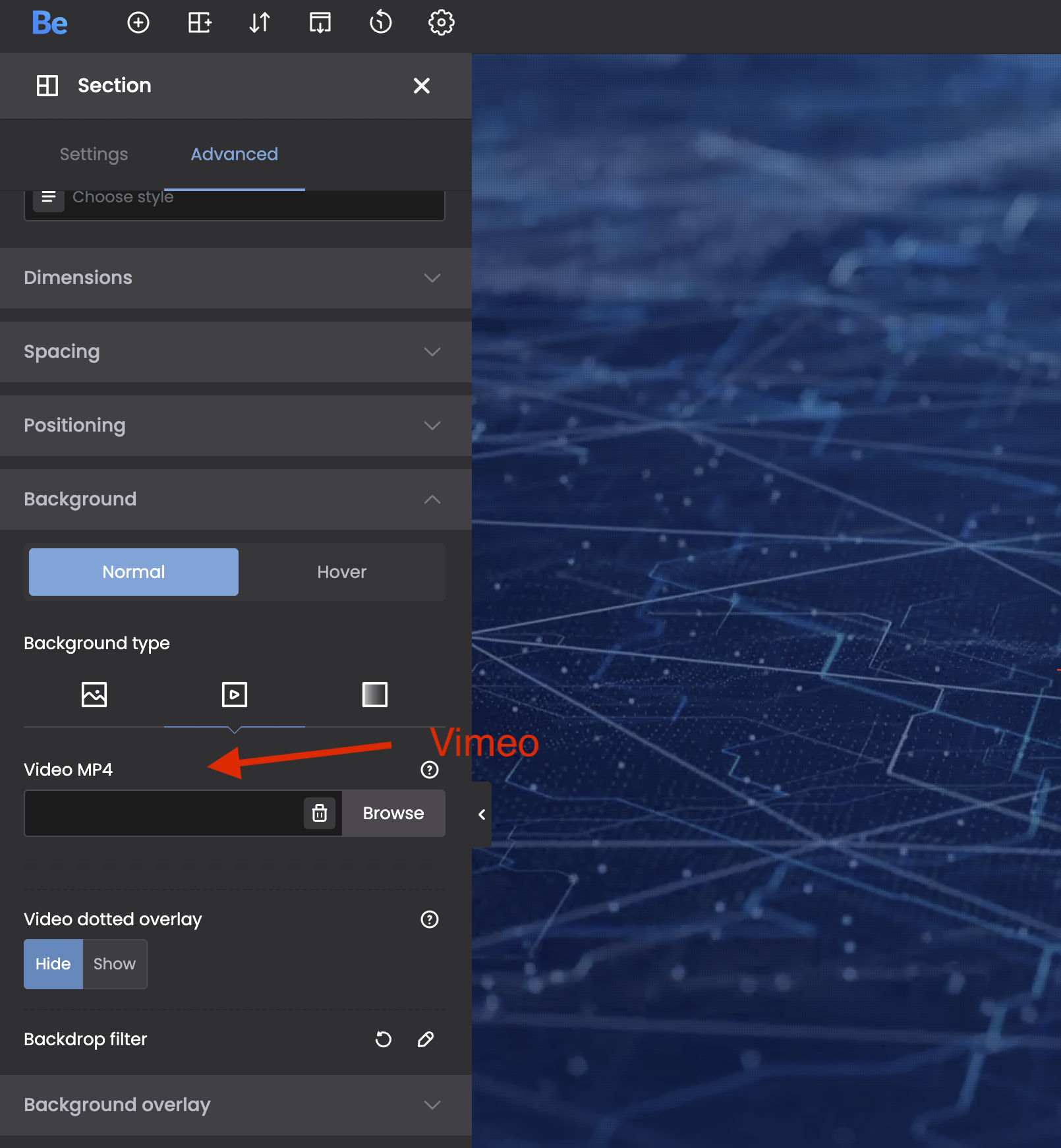 Hi, this is not possible at the moment, but would be great to insert vimeo directly in the section background – for better website performance