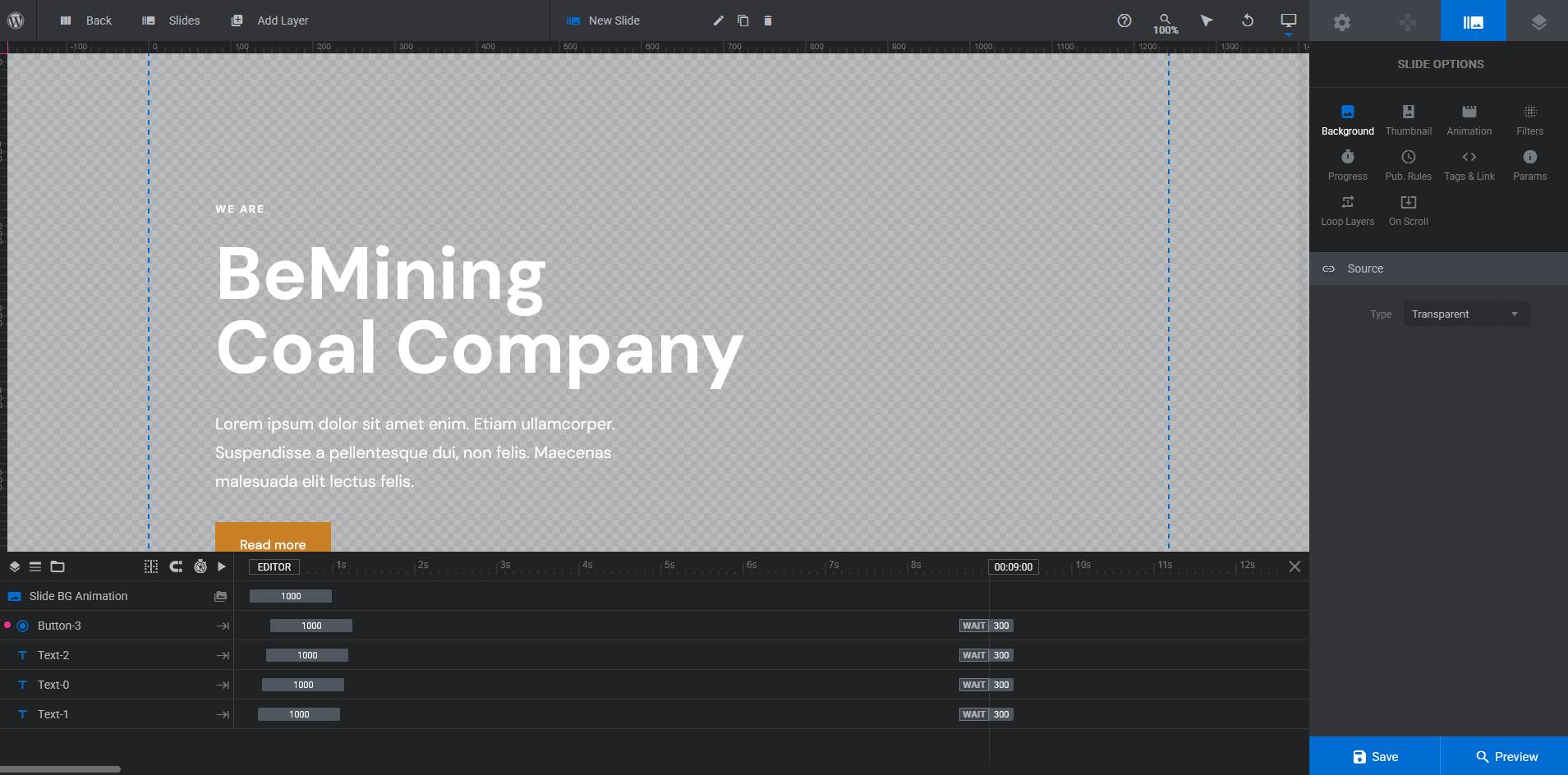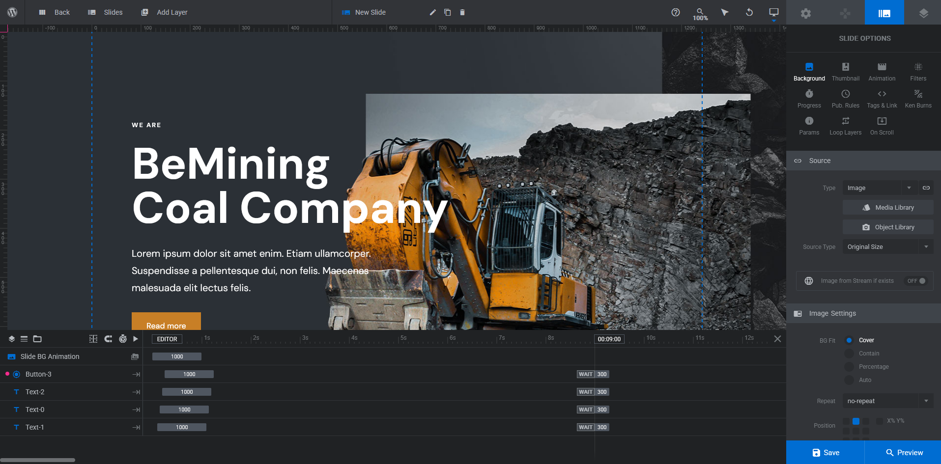I am using the pre-built theme “Mining 2”, which uses the Slider Revolution plugin on the homepage for the text and the construction site image.
