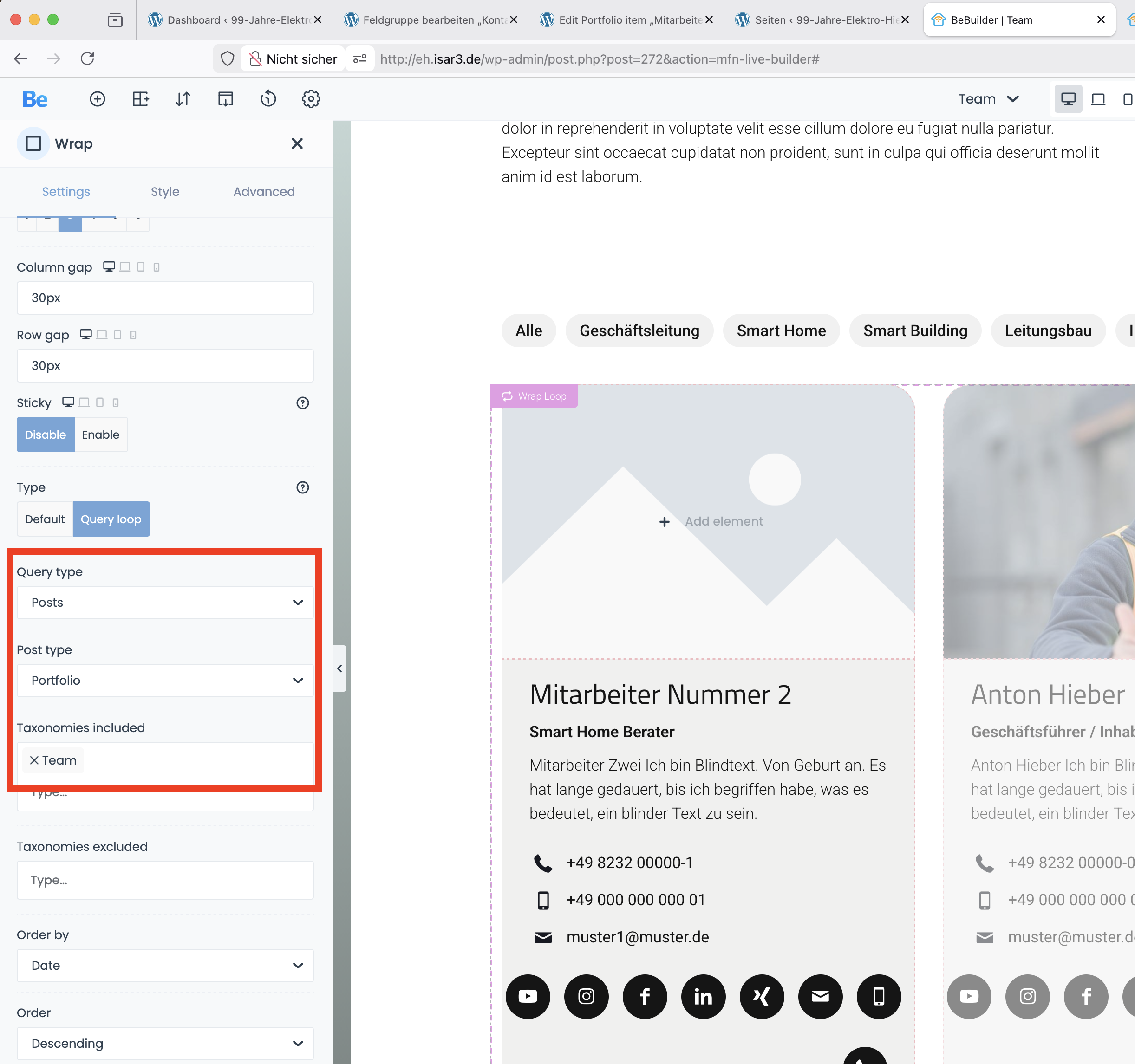 Also – this should not be my Portfolio Page – I want to use this to display the team. That is why I built the boxes using Query loops and ACF.