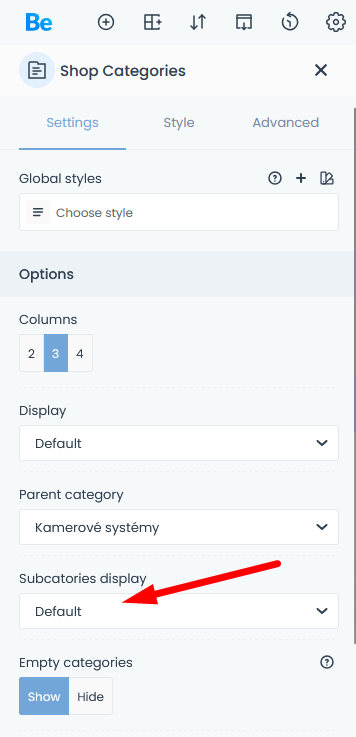 • Second question: how to display subcategories of the current main category I am currently in, I haven't figured out such a setting.
