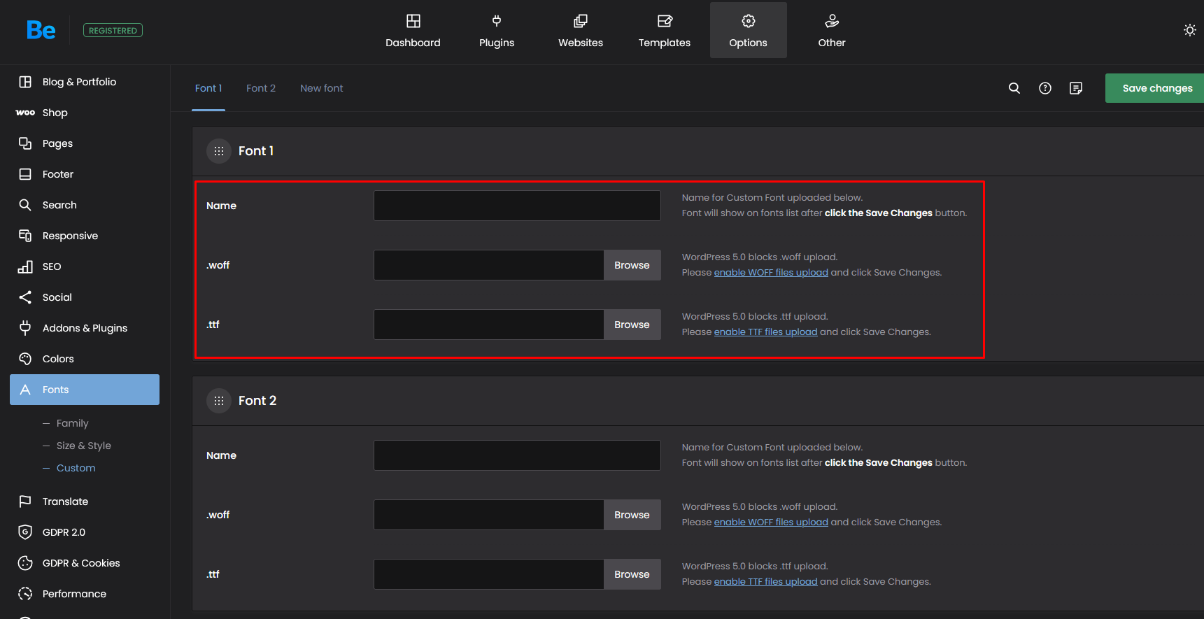 Here's the CSS I put in Theme Options (see below) while putting this HTML in the Visual Editor text, but it isn't working - the font Rubik Distressed - isn't loading. The HTML: <p class="dropcap_1">Once upon a time, in a land far away... It’s important because of the things that have happened in my personal life concerning this subject.</p>