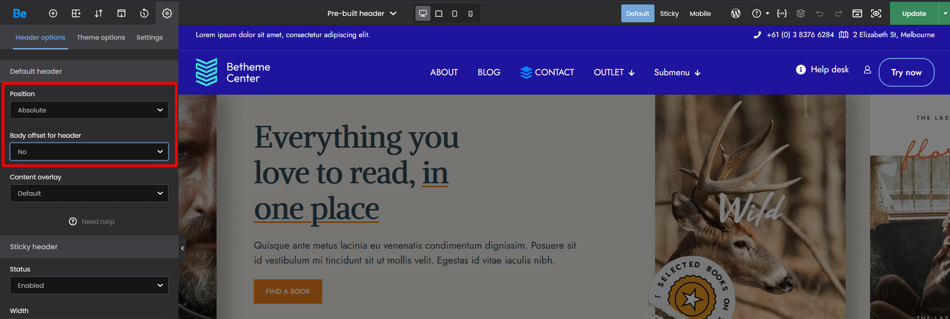 Edit your header template and go to the template settings. Then change the position to absolute with no body offset: