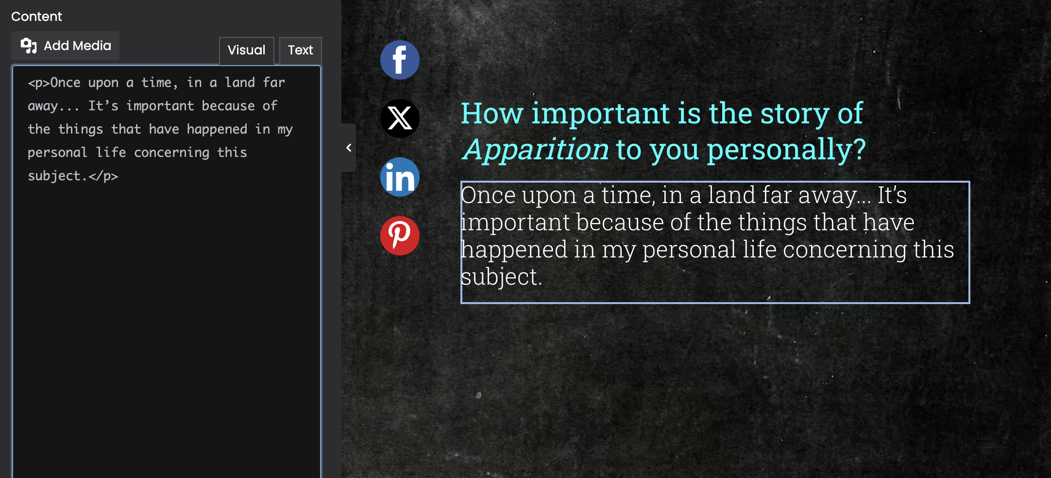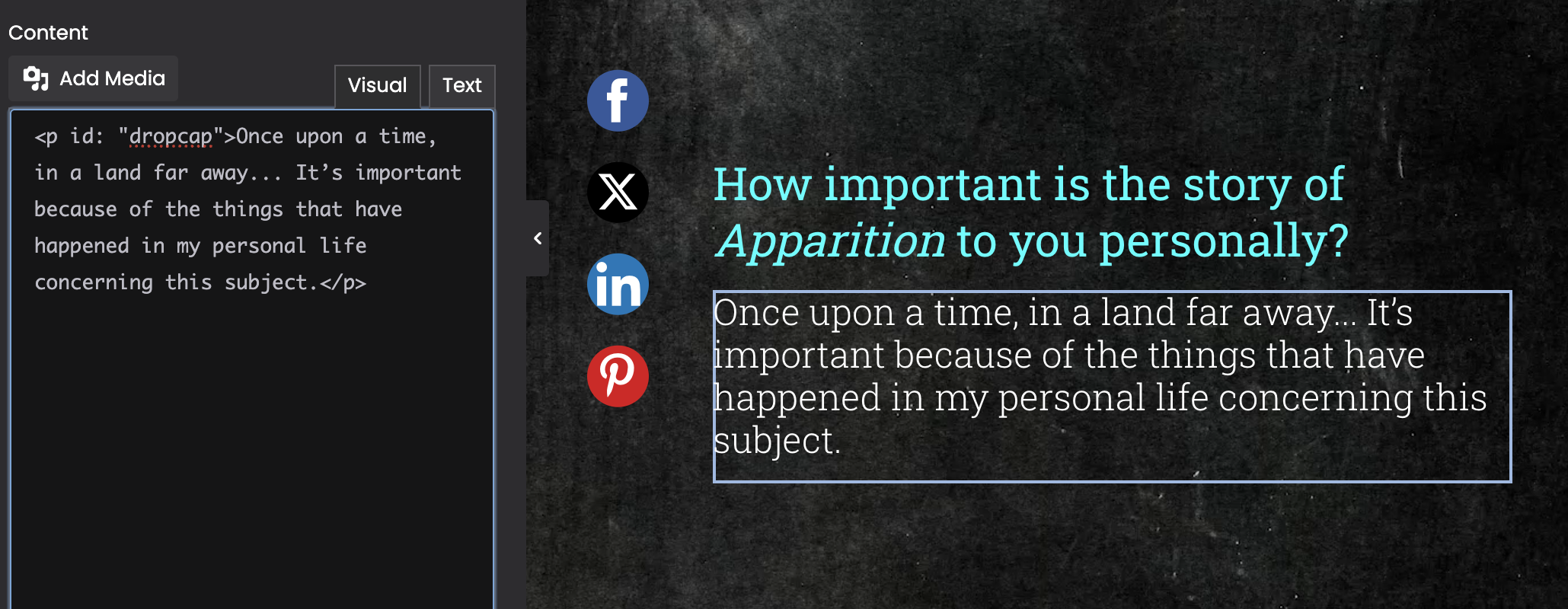 Every time I put <p id: "dropcap">Once upon a time, in a land far away... It’s important because of the things that have happened in my personal life concerning this subject.</p> in the Text on this page, for example, it deletes it by itself after I press Visual. When you said "pseudoclasses are unnecessary," I assume you mean the p:first-of-type::first-letter in the .dropcap p:first-of-type::first-letter code? But how do I make only the first letter a dropcap?