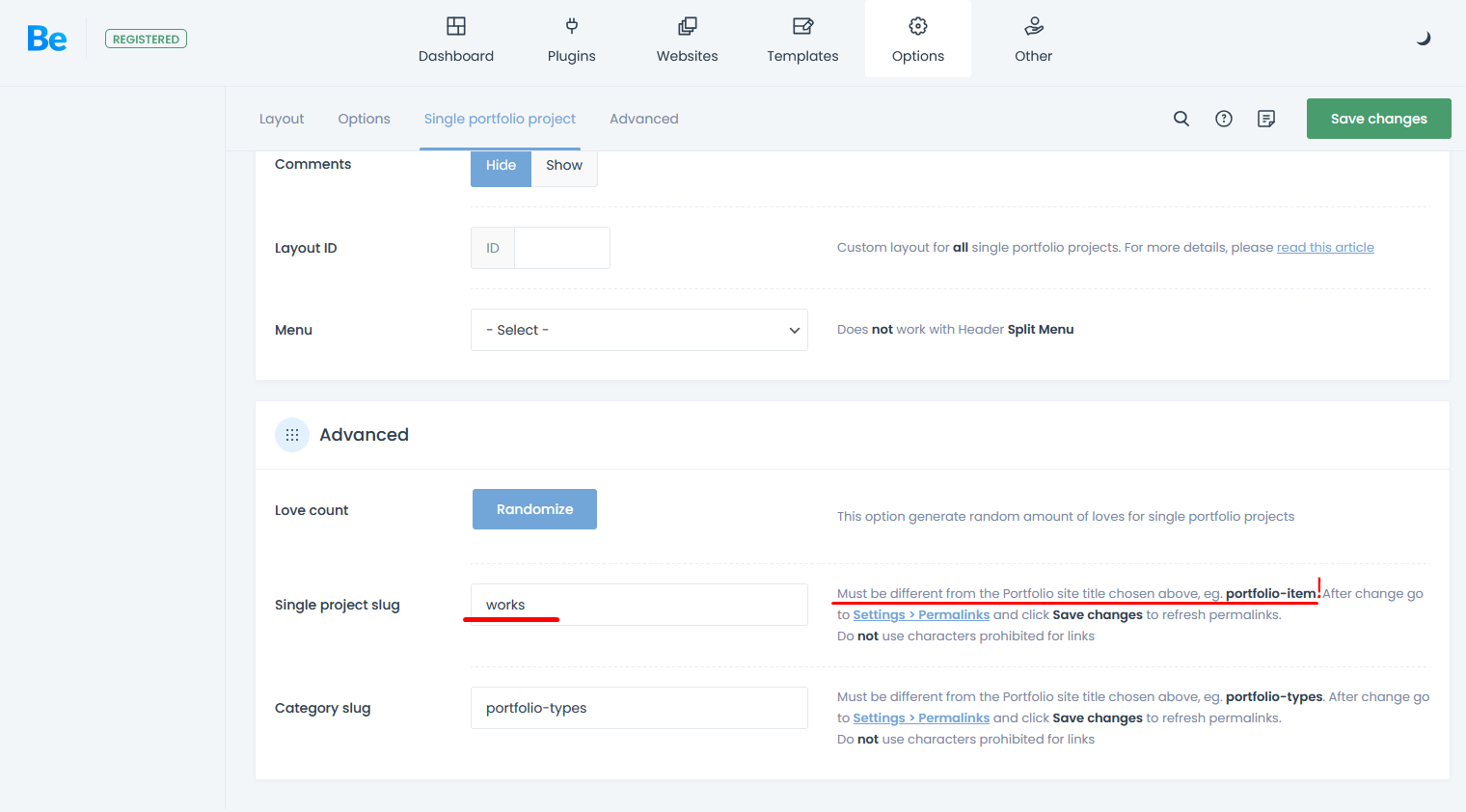 I already changed the single project slug because all the pages under Works were unreachable.