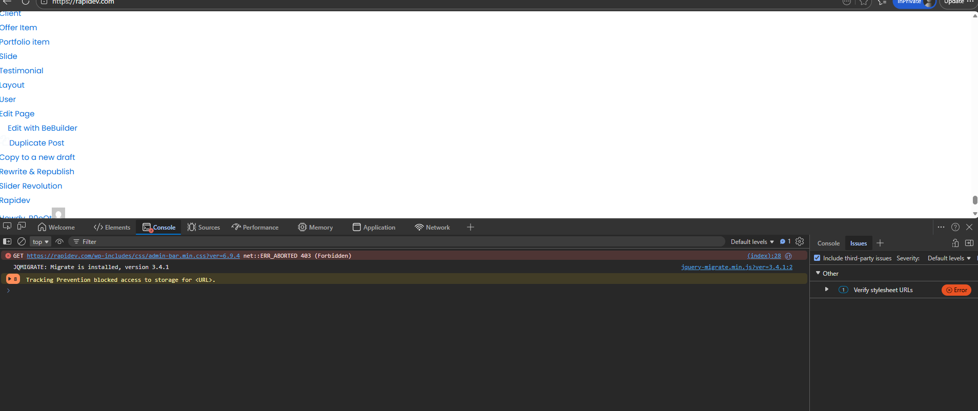 Issue 02: Failed to load CSS files. "(index):28 GET https://rapidev.com/wp-includes/css/admin-bar.min.css?ver=6.9.4 net::ERR_ABORTED 403 (Forbidden)"