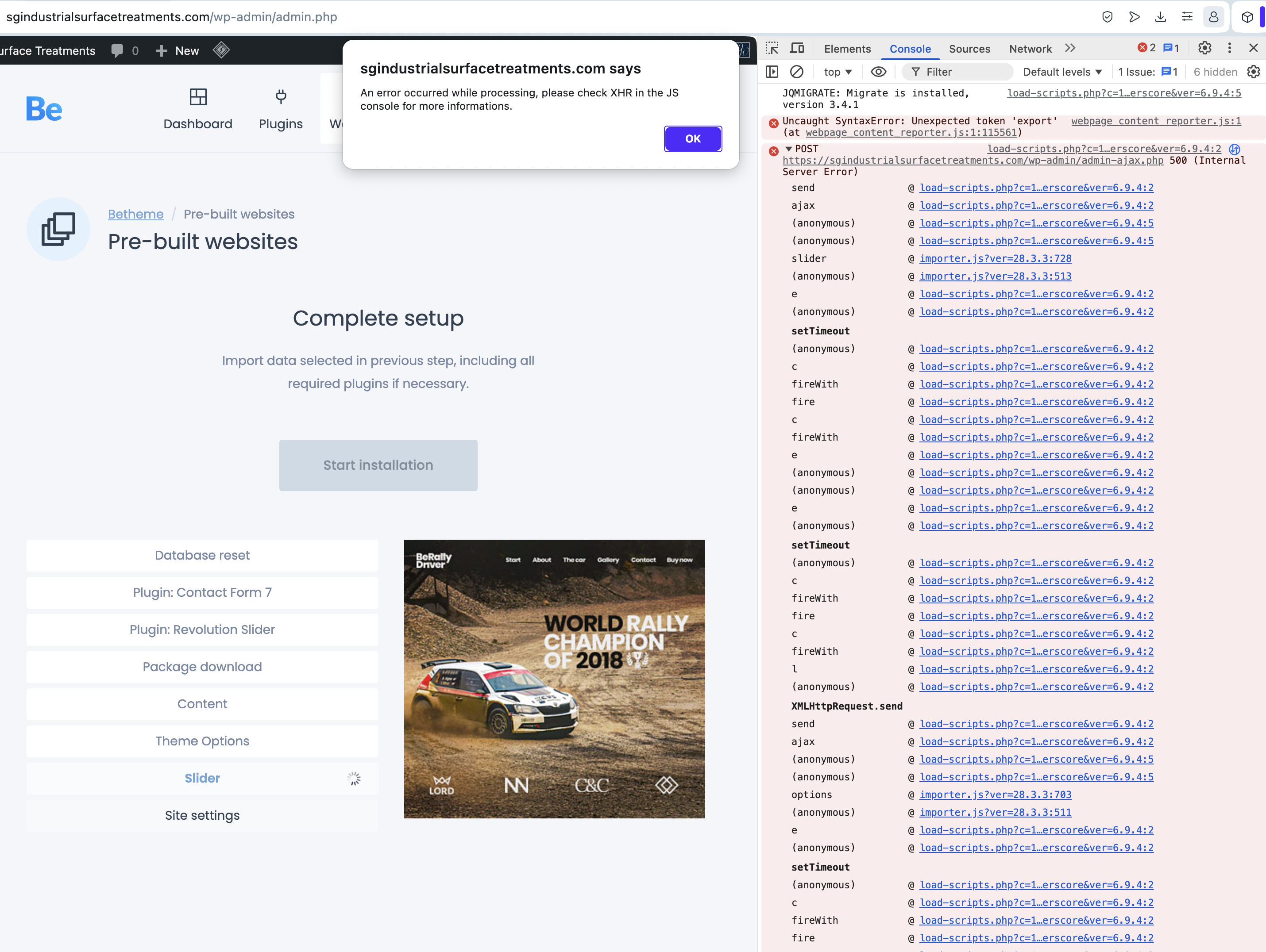I am trying to install the pre-built website named Rally. I am not able to install it because it gives me an error when it gets to the Slider installation portion. I am attaching a screenshot showing the error and a partial list of the errors in the JS console. I have already contacted my hosting provider and they have increased the php version and php limits. I have also tried several different pre-built websites that include Rev Slider and they all fail. However, if I choose not to include the Rev Slider content and installation then the pre-built website installs just fine.