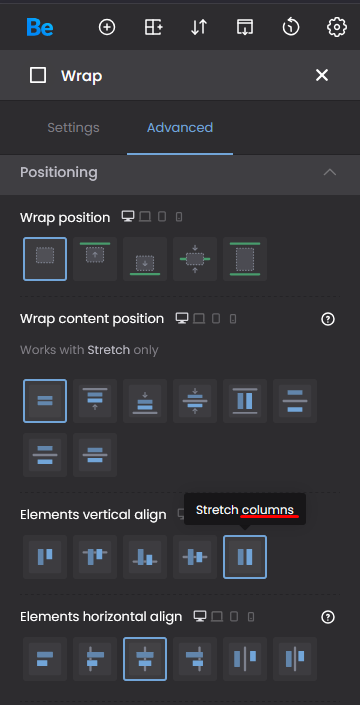 Stretch in section options affects wraps only, and stretch in wraps affects columns only.