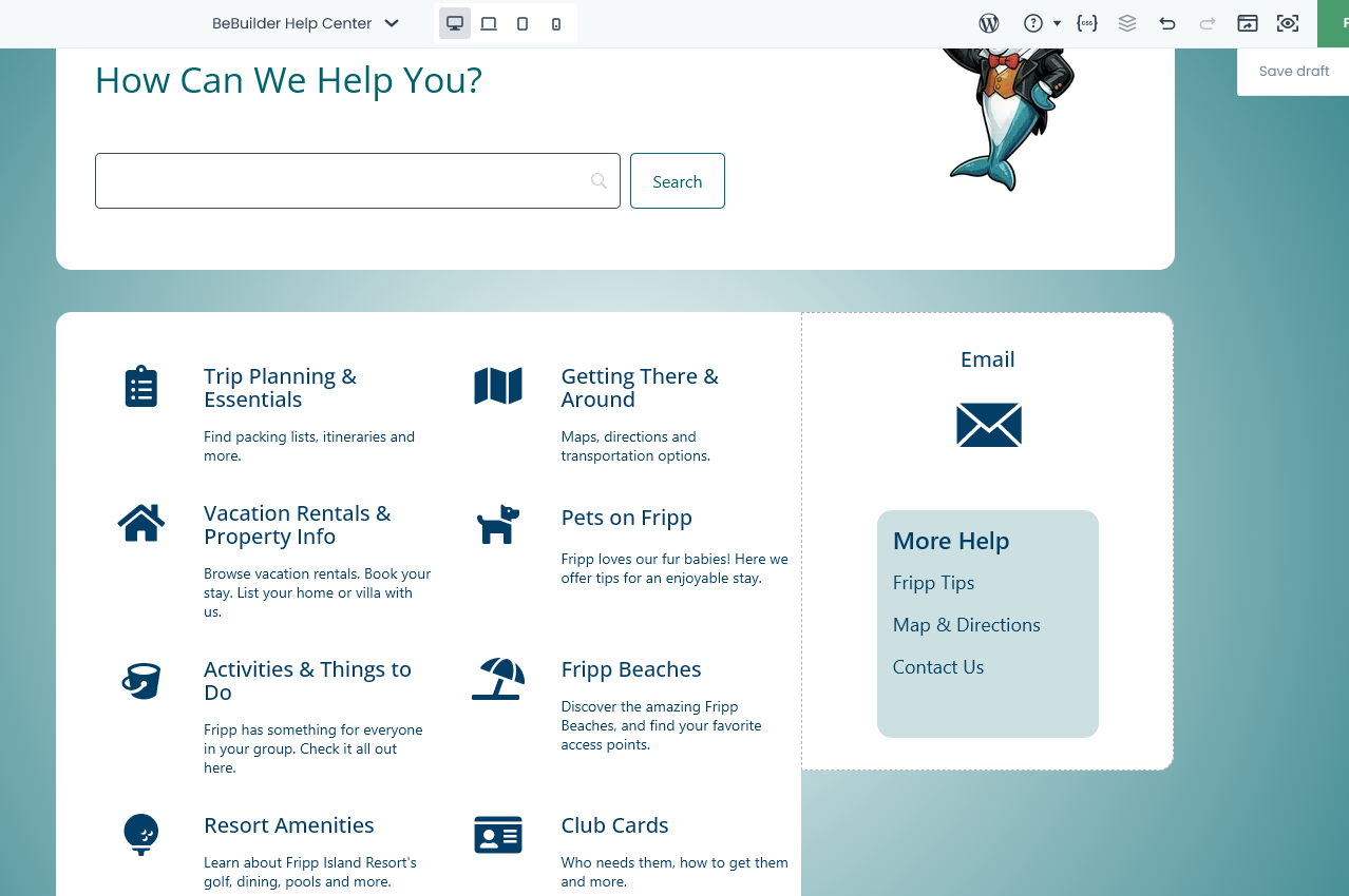 I don't know how to explain what's happening - my design in Bebuilder is not reflected in the Frontend of the page. The page is called Bebuilder Help Center. It is in draft mode. Page: https://frippislandstay.com/?page_id=156852 I will provide credentials.