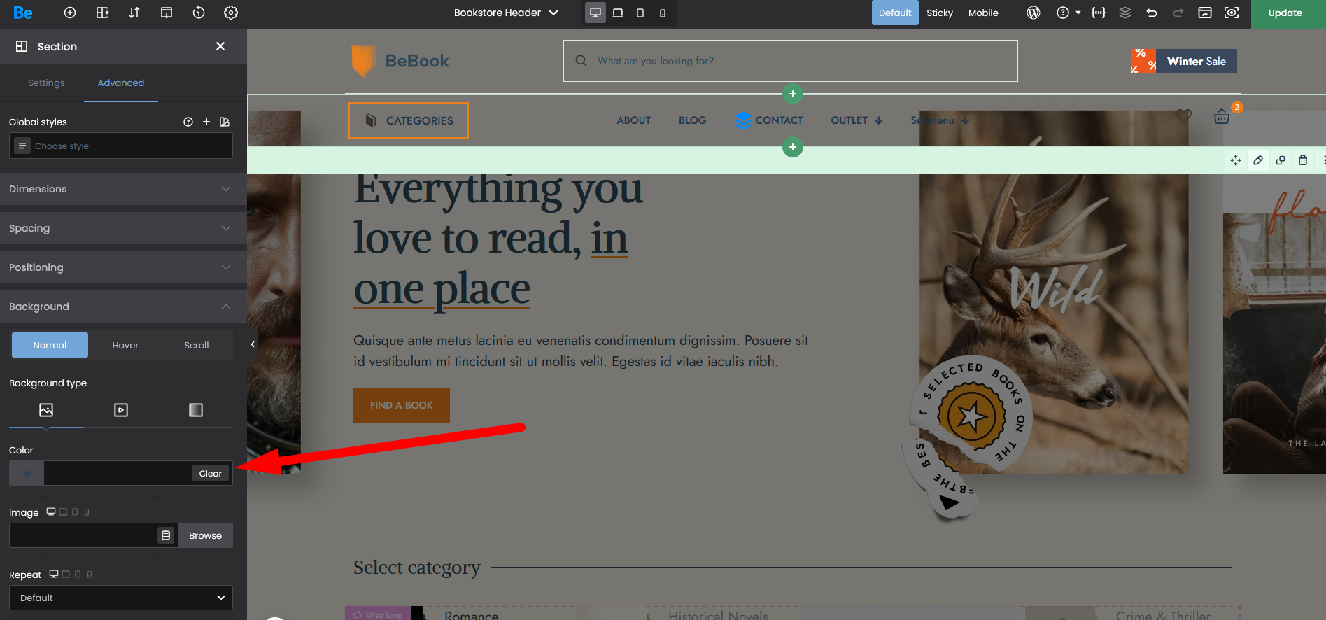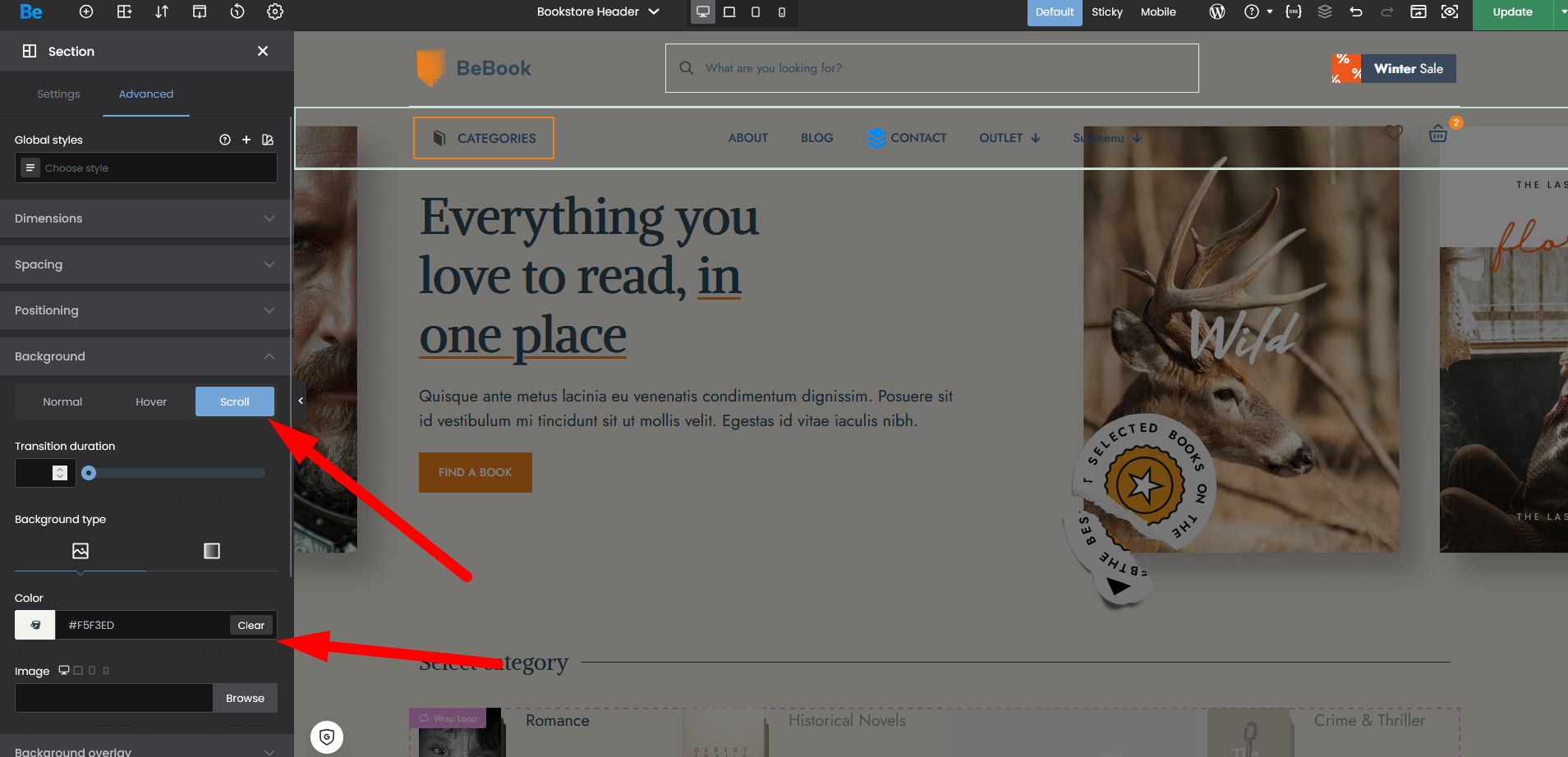 Your sections' backgrounds colors fields must blank, but set the color for the Scroll state: